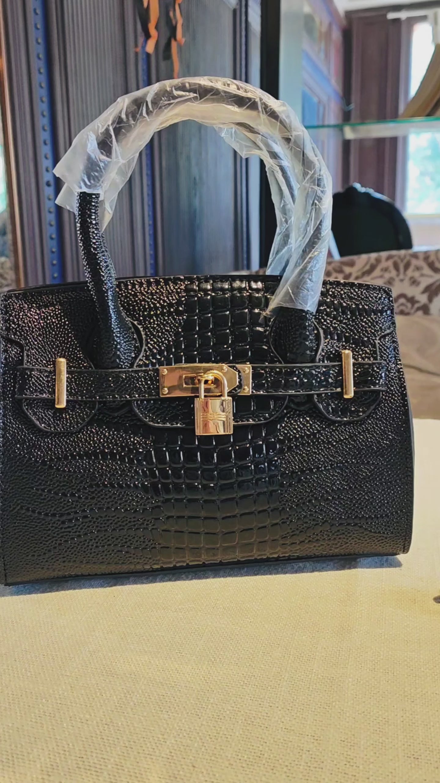 Centered on full-panel precision-embossed crocodile texture with staggered depth and realistic details, paired with gold metal locks and hardware accessories, creating a luxurious contrast between glossy leather and metallic luster; the retro crocodile pattern combined with the classic black-gold color scheme retains elegant texture while adding delicate details, suitable for sleek and atmospheric styling.