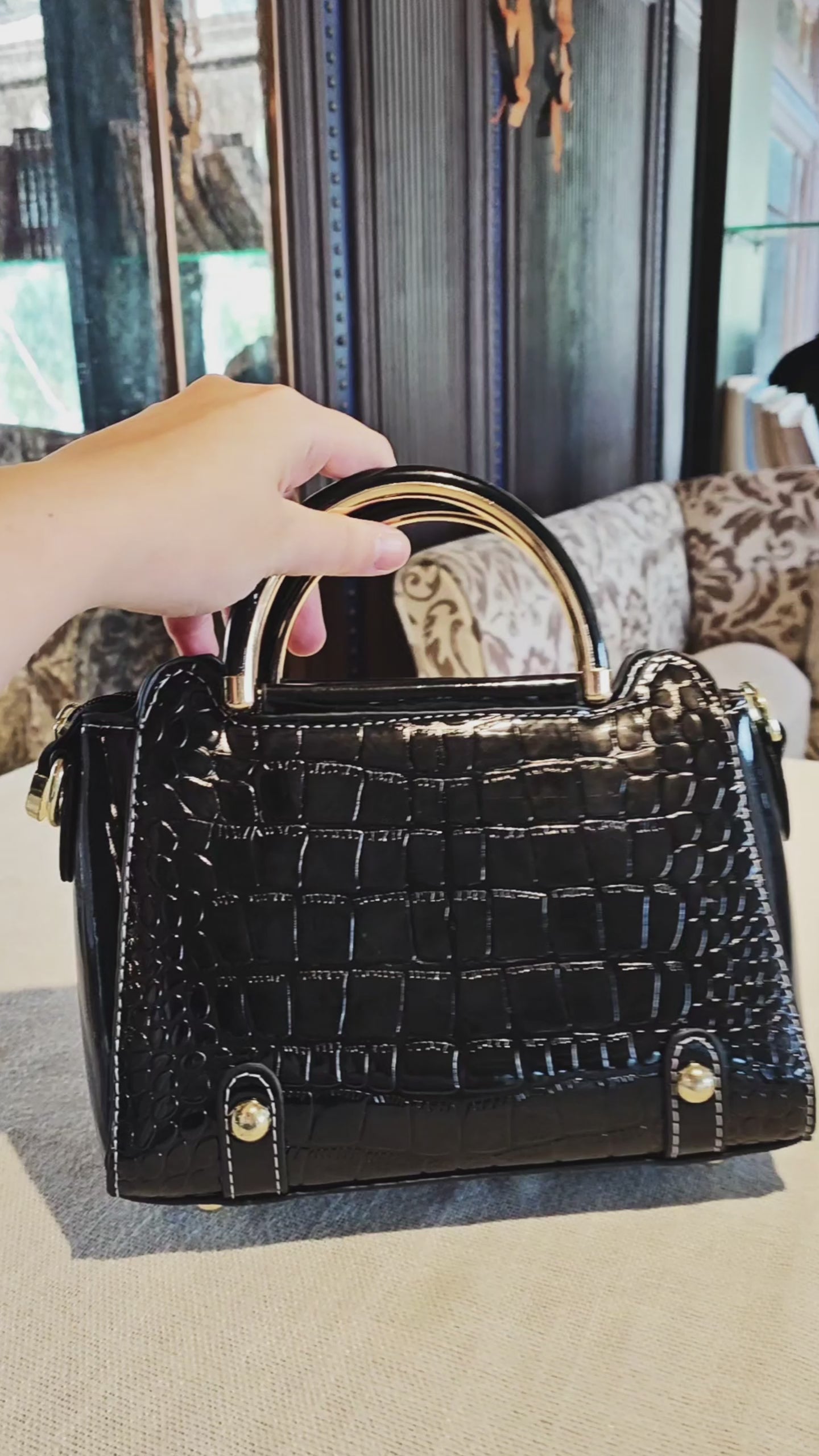 Centered on full-panel precision-embossed crocodile texture with staggered depth and realistic details, paired with light gold metal ring handles + hardware decorative buckles, creating a luxurious collision between retro texture, glossy material, and metal elements; the black base + metal details exude capable temperament, suitable for minimalist upscale styling, easily enhancing outfit texture.