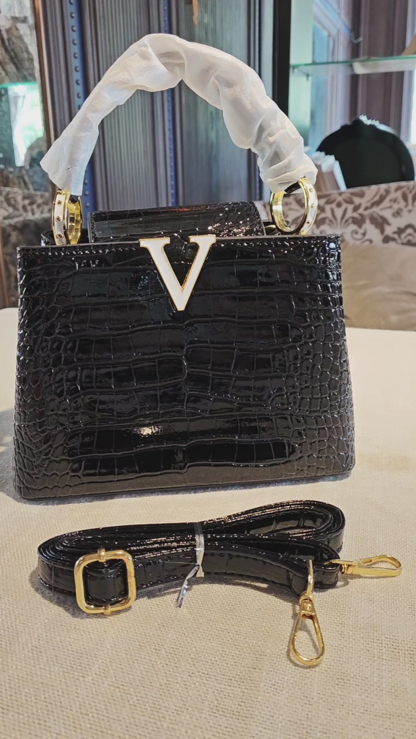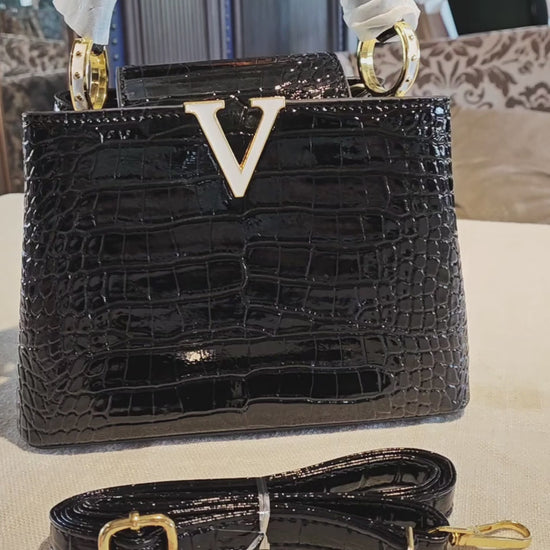 Black Crocodile-Embossed Structured Handbag with Gold 'V' Accent and Detachable Strap
