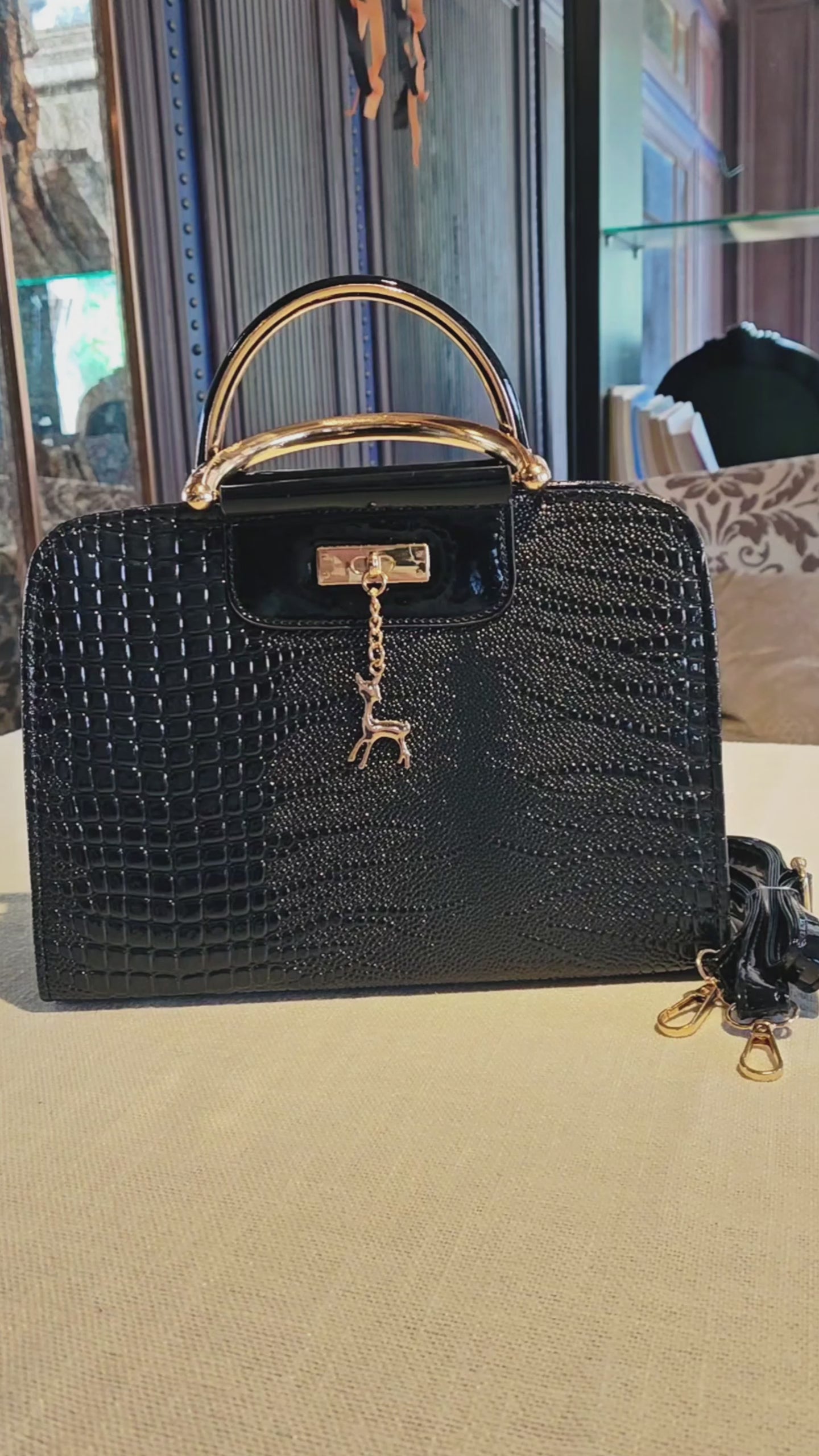 Centered on full-panel precision-embossed crocodile texture with staggered depth and realistic details, paired with glossy leather splicing + gold metal hardware + deer charm, creating a luxurious contrast between retro texture and metallic luster; the classic black crocodile pattern combined with the delicate charm retains calm texture while adding exquisite details, suitable for capable and upscale styling.
