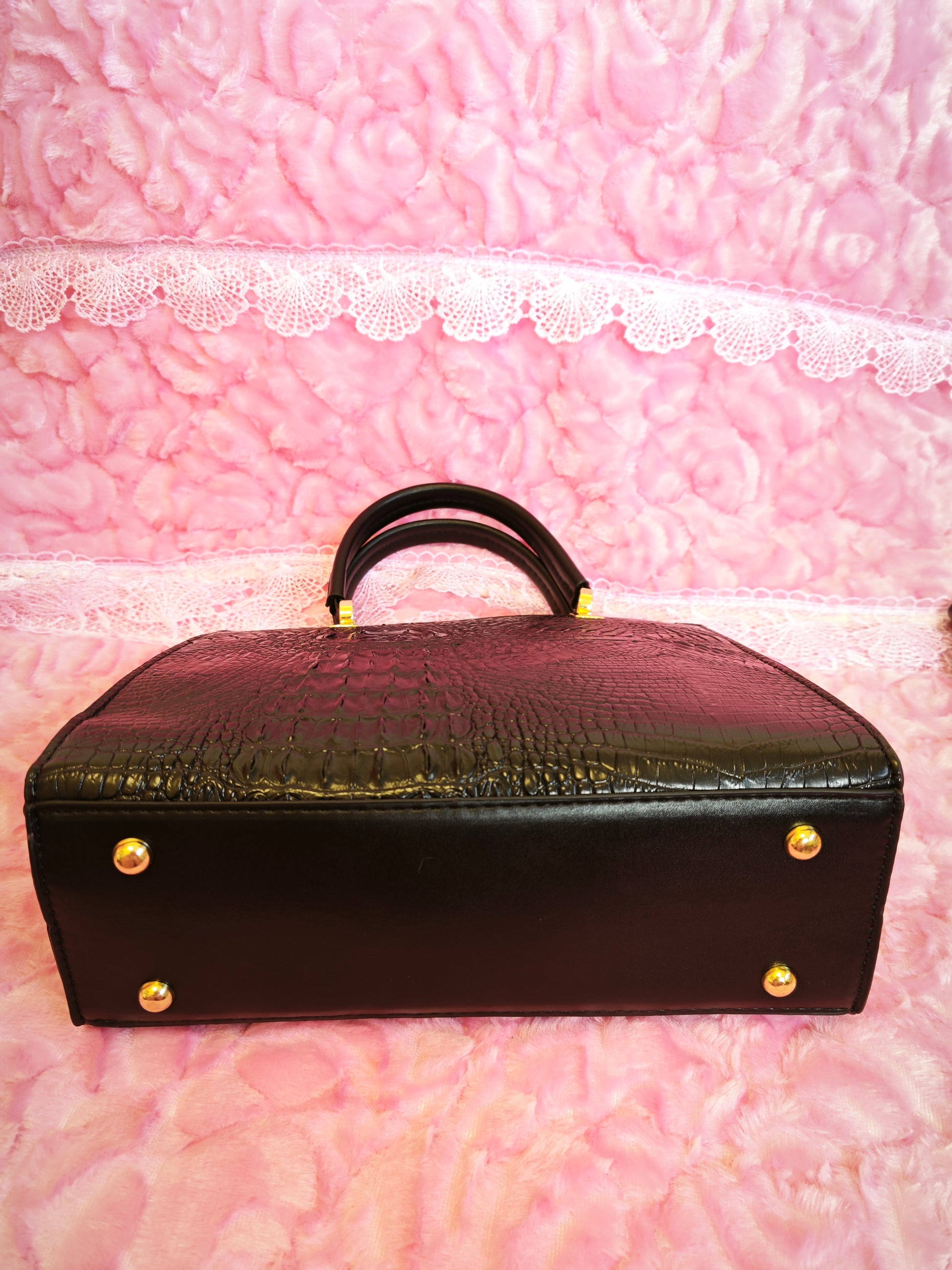 Classic tote bag silhouette (neat and stiff lines), paired with "crocodile pattern texture + heart-shaped pendant + mother-child bag design" as accents—it combines "mirror jet-black base + crocodile pattern texture + gold hardware"; the calm texture of jet-black collides with the soft details of the pendant to create an "elegant light luxury style"; the jet-black bag body comes with a "versatile high-end filter," suiting workplace commuting, business gatherings, daily outings and other style scenarios as a "temperament texture anchor" for outfits.