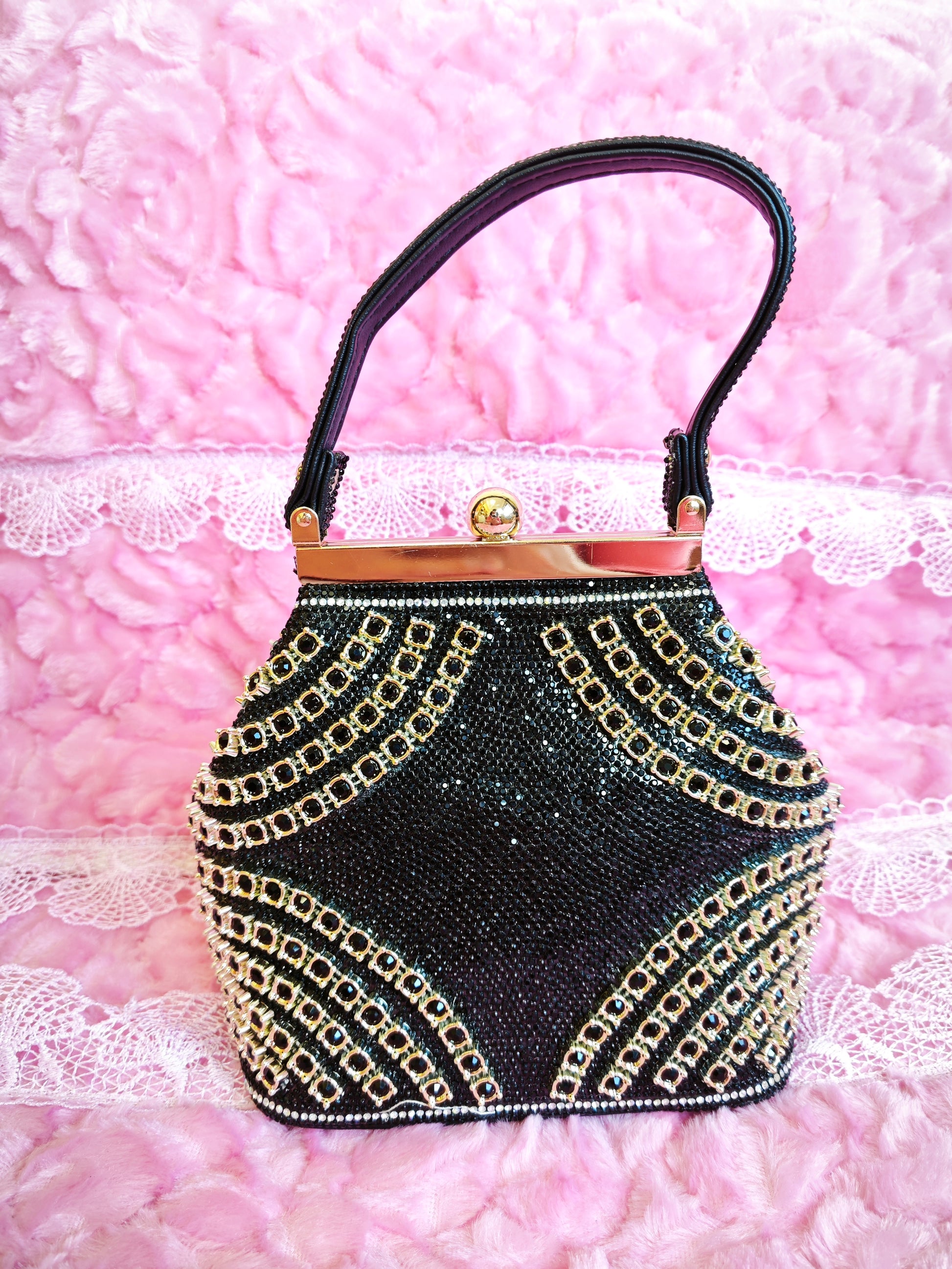 It features a classic trapezoidal clutch bag silhouette (neat and magnificent lines, three-dimensional and straight outline), highlighted by "full black gold diamond inlay + black leather base + pearl lock hardware". The combination of "black gold diamond totem + black gold leather background" creates a "cool luxury dinner style" with cool black gold diamond luster and calm leather texture. The trapezoidal bag has an "eye-catching focal filter", and the clutch bag shape is suitable for high-end banquets, dark theme parties, red carpets, annual meetings and other formal style scenarios, making it a "cool highlight" for outfits.