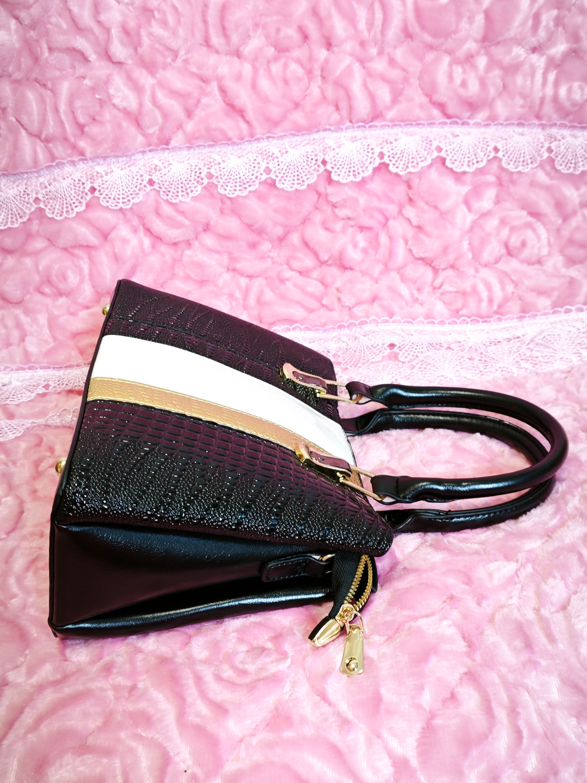 Black & Gold-White Crocodile-Print 3-Piece Handbag