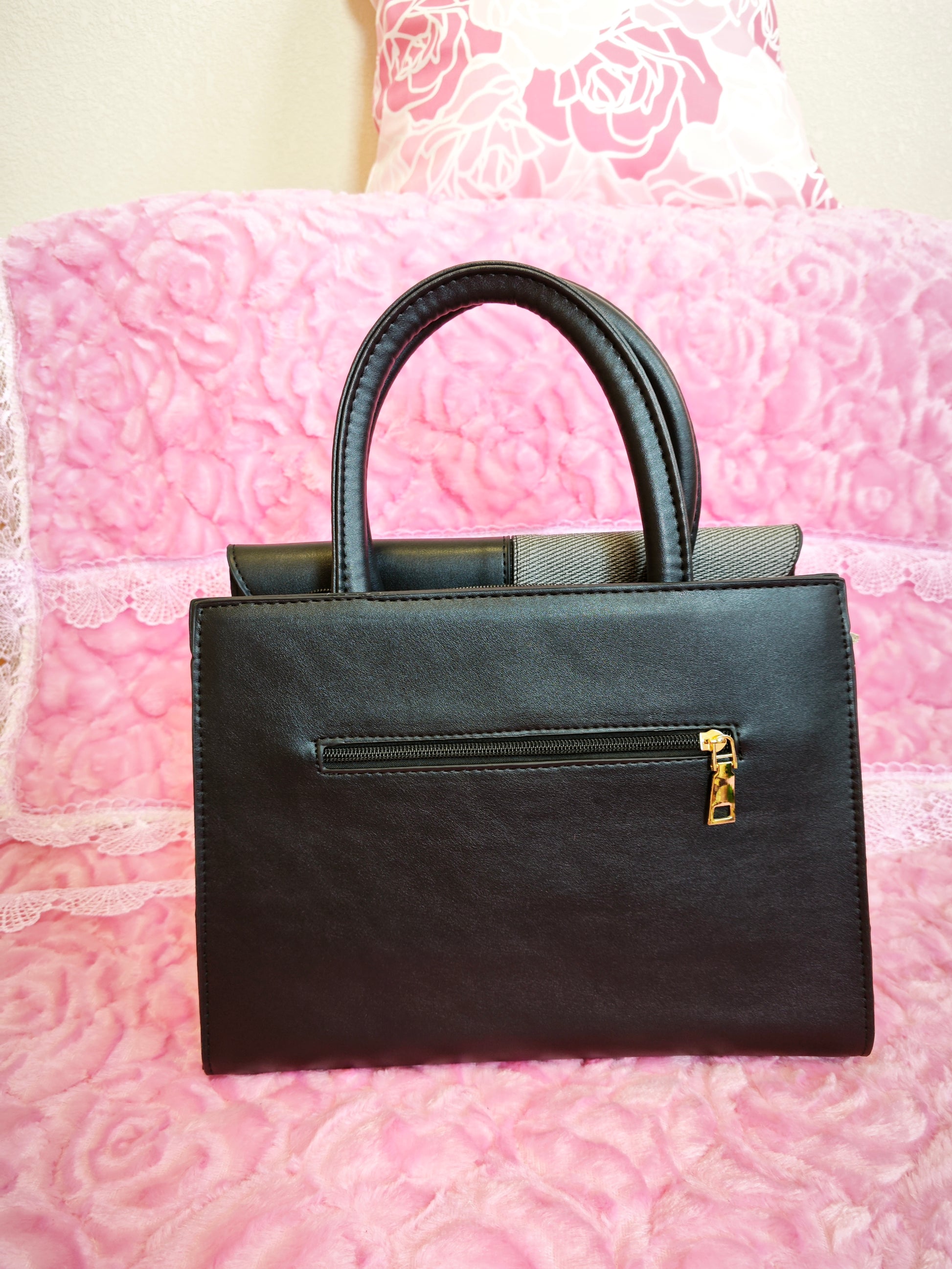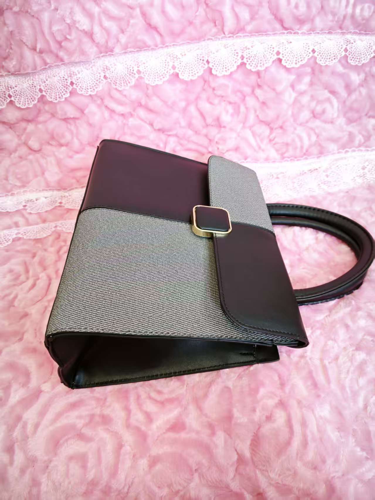 Classic mother-child handbag silhouette (neat and simple lines), paired with "color-block material splicing + metal square buckle" as accents—it combines "onyx black base + dark gray woven fabric + gold hardware"; the calm texture of jet-black and the exquisite details of the material splicing create a "minimalist light luxury commuter vibe"; the onyx black bag body comes with a "versatile high-end filter," suiting workplace, business, daily and other style scenarios as an "understated texture anchor" for outfits.
