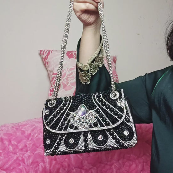 Black & Silver Bead-Crystal Geometric-Pattern Chain Evening Clutch