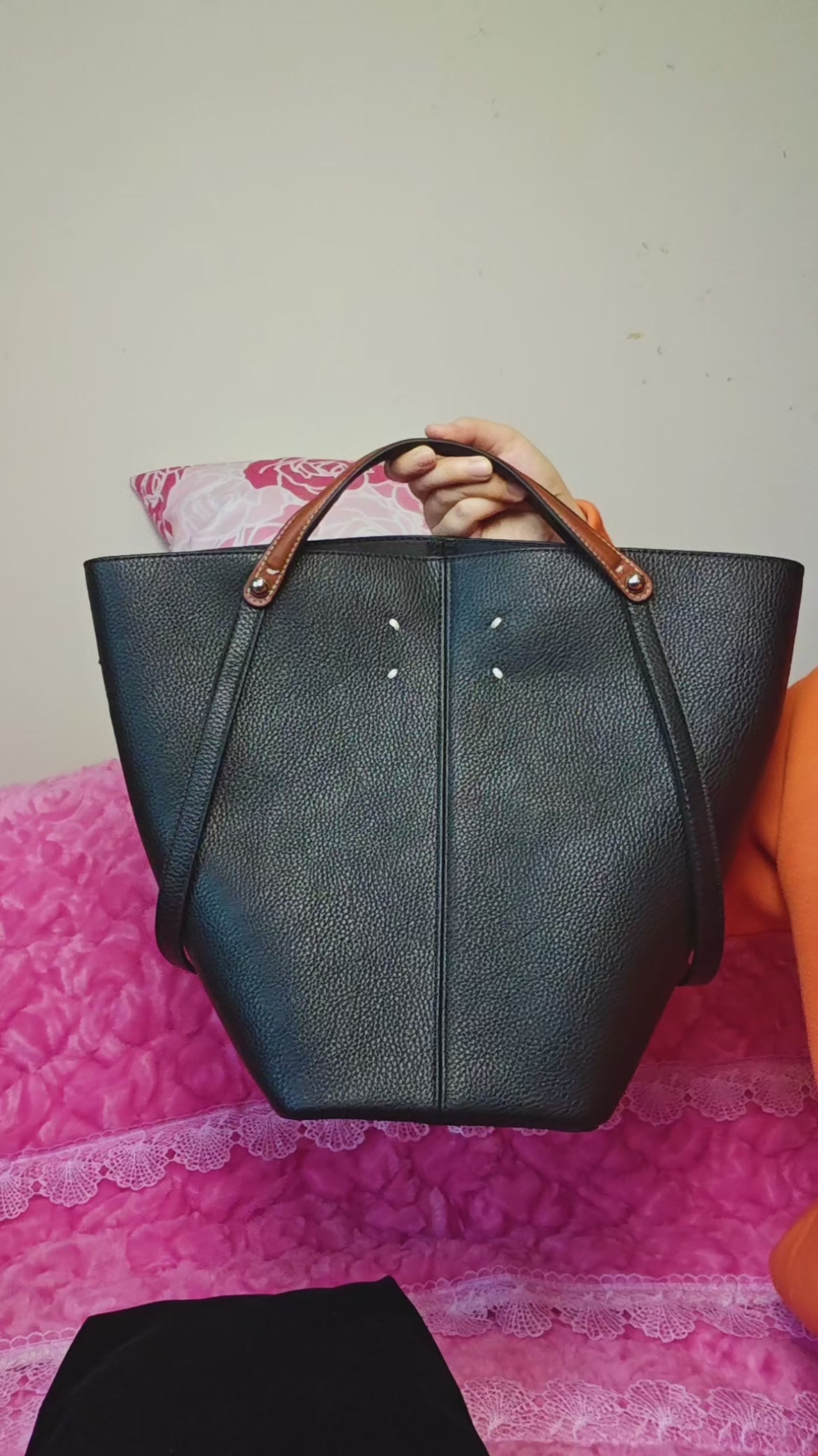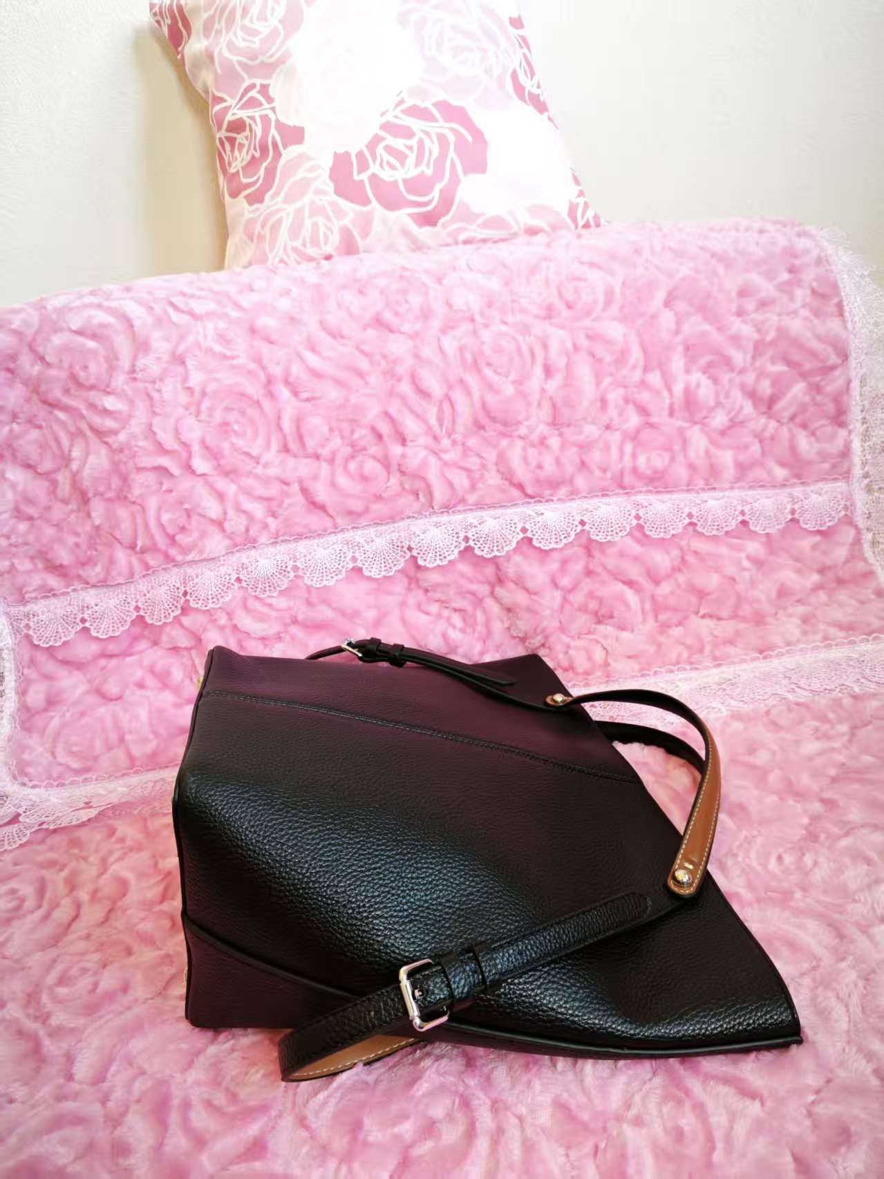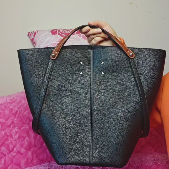 Sleek bucket tote silhouette (soft and smooth lines), paired with "lychee pattern texture + contrast handle" as accents—it combines "deep jet-black base + lychee pattern texture + contrast handle"; the calm texture of jet-black collides with the exquisite details of the pattern to create a "minimalist light luxury commuter vibe"; the jet-black bag body comes with a "versatile high-end filter," suiting any style scenario as an "understated texture anchor" for outfits.