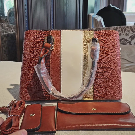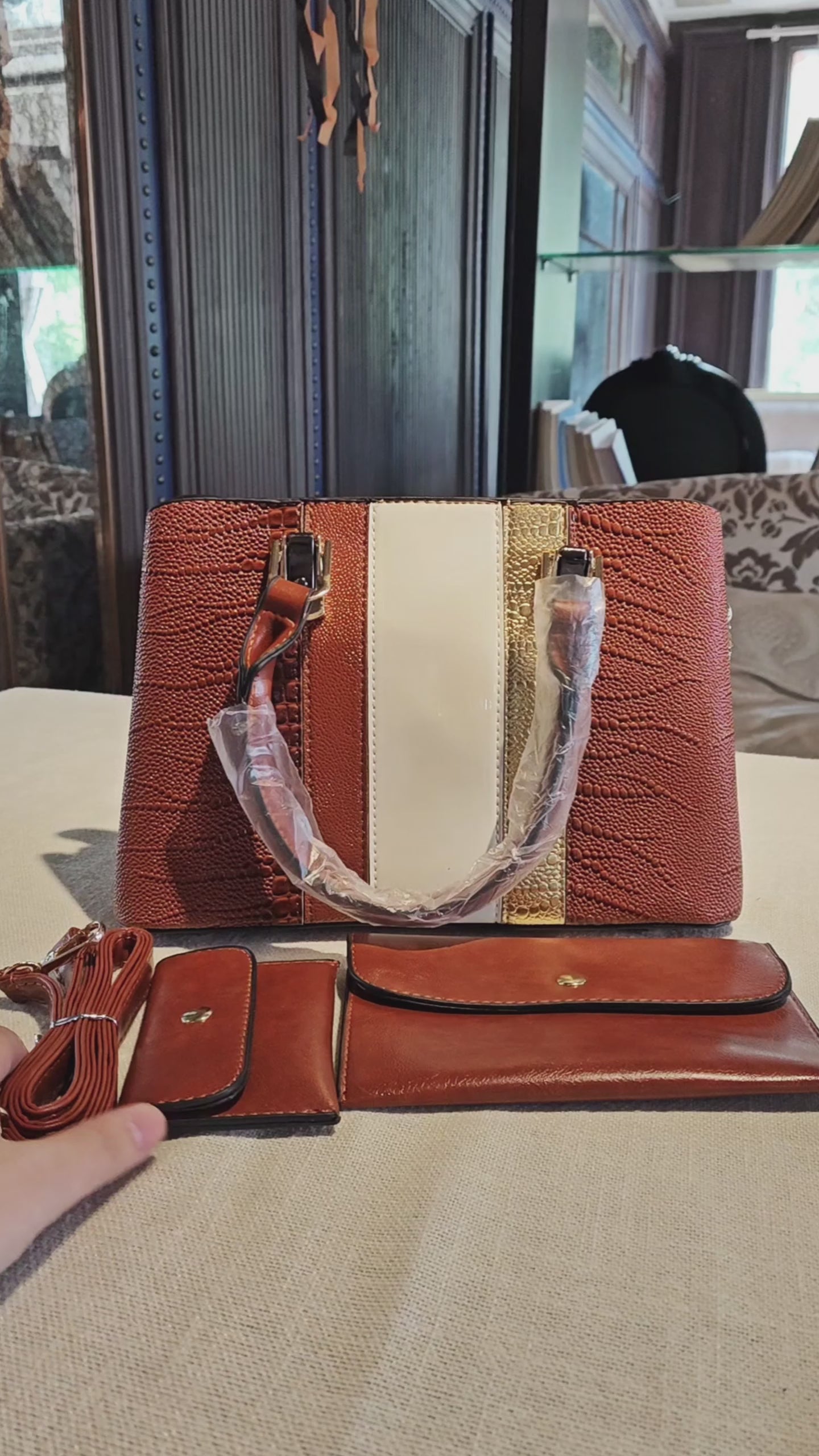 Brown Crocodile-Embossed Color-Block 3-Piece Bag Set with Detachable Strap