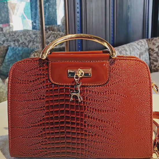 Brown Crocodile Pattern Boston Bag with Deer Charm