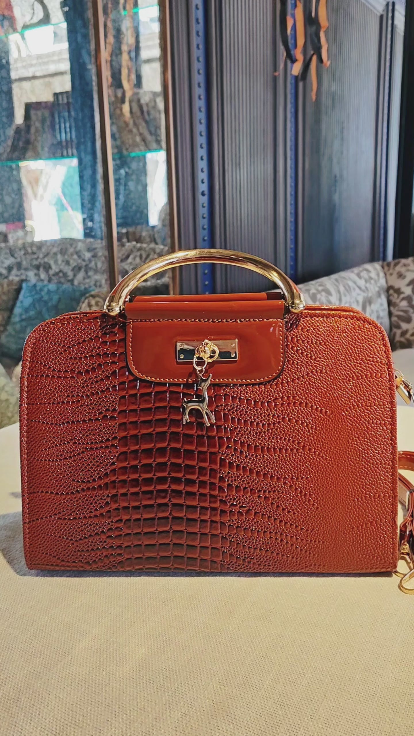 Centered on full-panel precision-embossed crocodile texture with natural depth transitions and realistic details, paired with a glossy leather panel on the flap for a contrast between matte and high-gloss materials; light gold metal hardware (handle loops, lock, strap buckles) + deer charm add a touch of retro luxury, blending vintage texture and delicate metal to suit mature or soft-elegant styling.