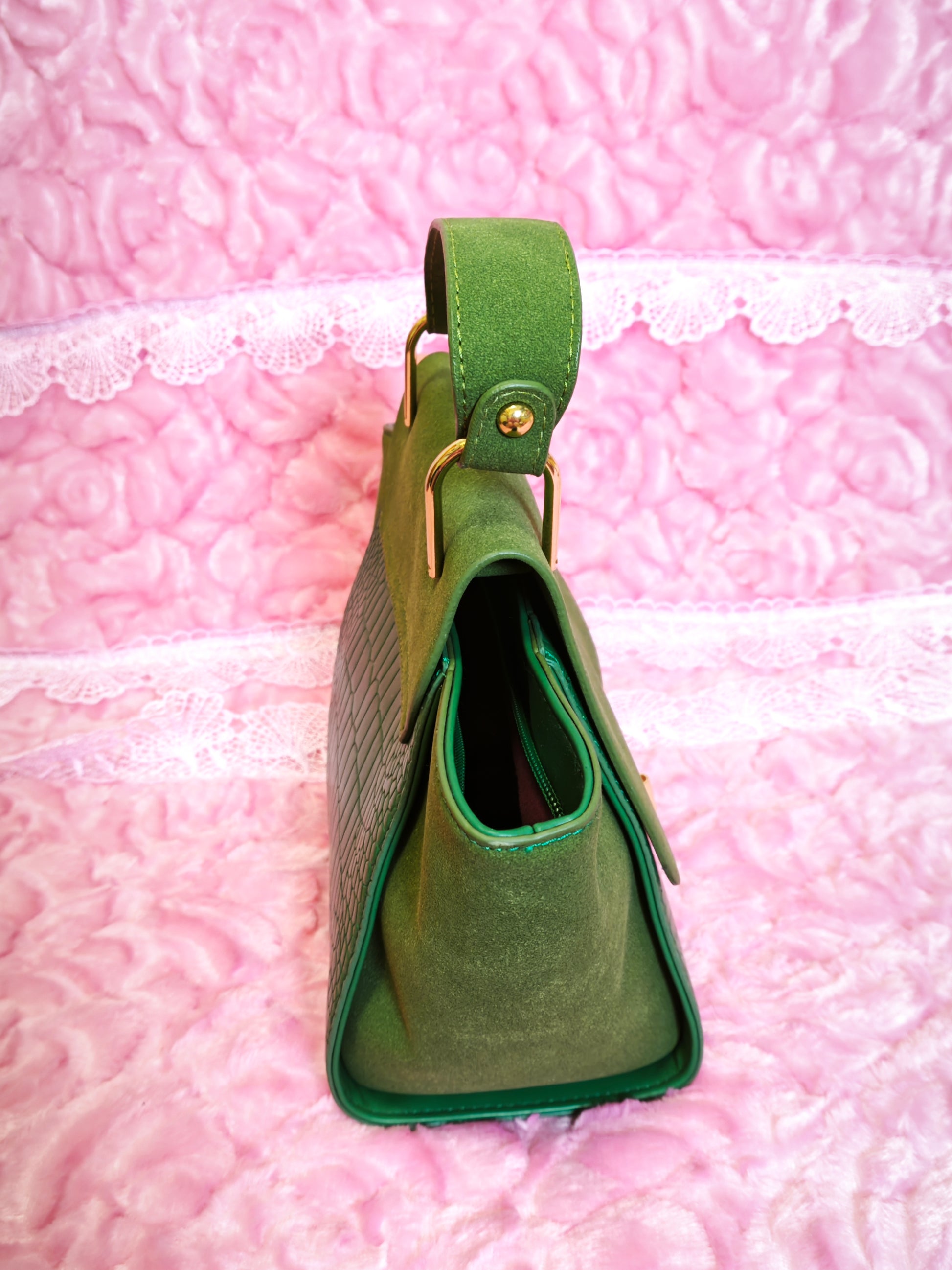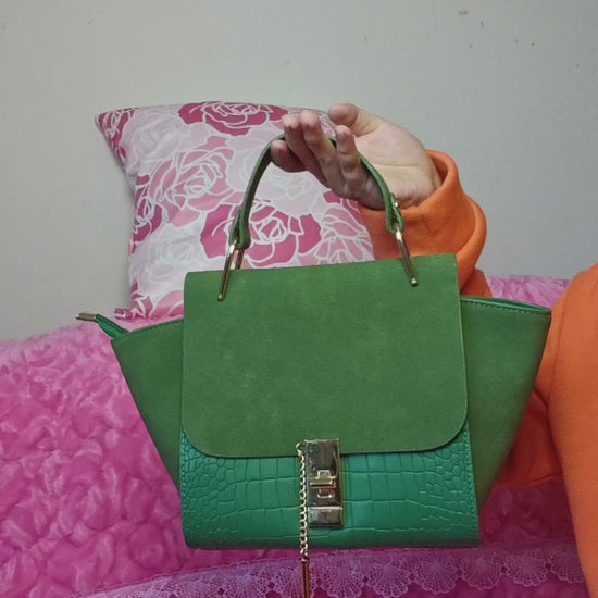 Dark Green Suede & Crocodile-Print Handbag with Metal Buckle