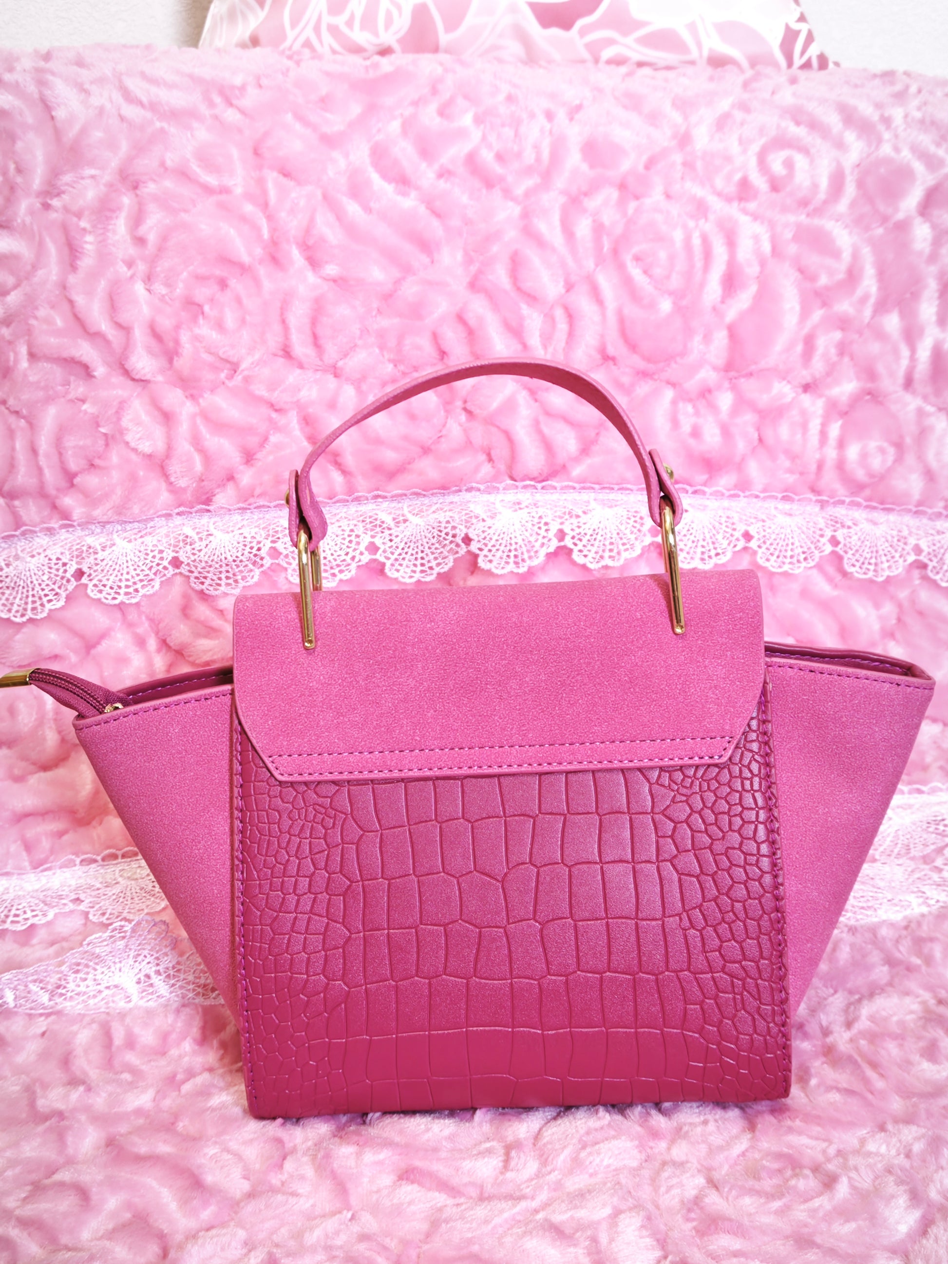 Fuchsia Suede & Crocodile-Print Handbag with Metal Buckle