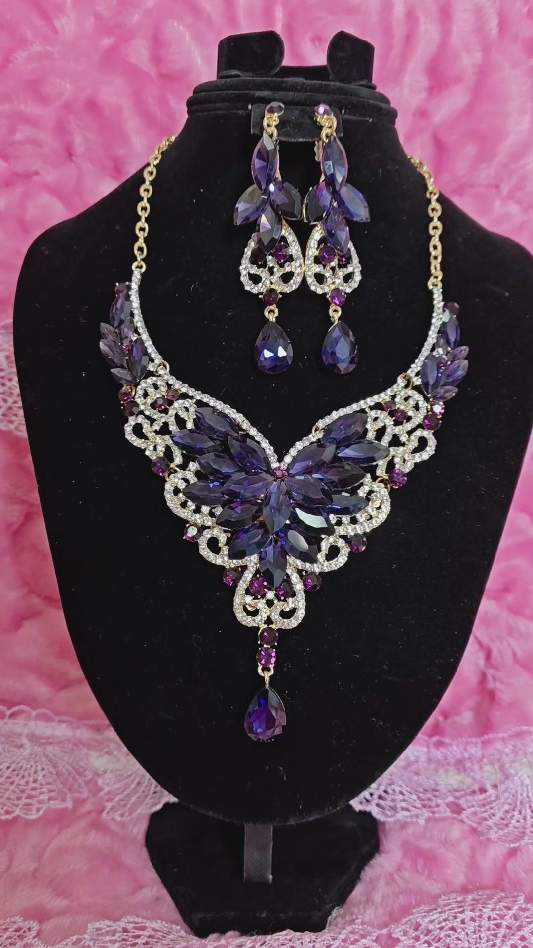 It features a heavy-duty butterfly-shaped dinner jewelry set design (full and three-dimensional lines with tension), highlighted by "eggplant purple rhinestone butterfly shape + pavé white small rhinestones + long pendant necklace design". The combination of "rich eggplant purple rhinestone base + shiny white small rhinestone border color contrast + gold metal luster" creates a "luxurious retro + light luxury dinner style" with transparent rhinestone texture and luxurious gold metal luster. The combination of long pendant necklace + drop earrings has a "neck line modification atmosphere filter", and the shape is suitable for dinners, cocktail parties, high-end annual meetings, stage performances and other formal style scenarios, making it a "luxurious highlight" for outfits.