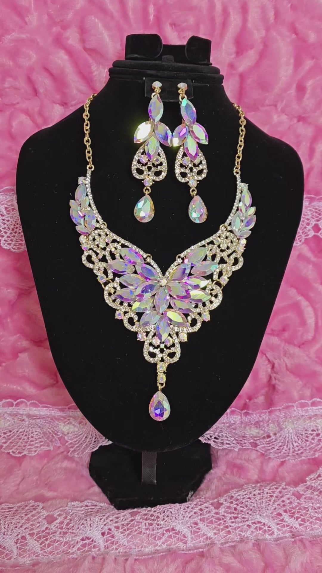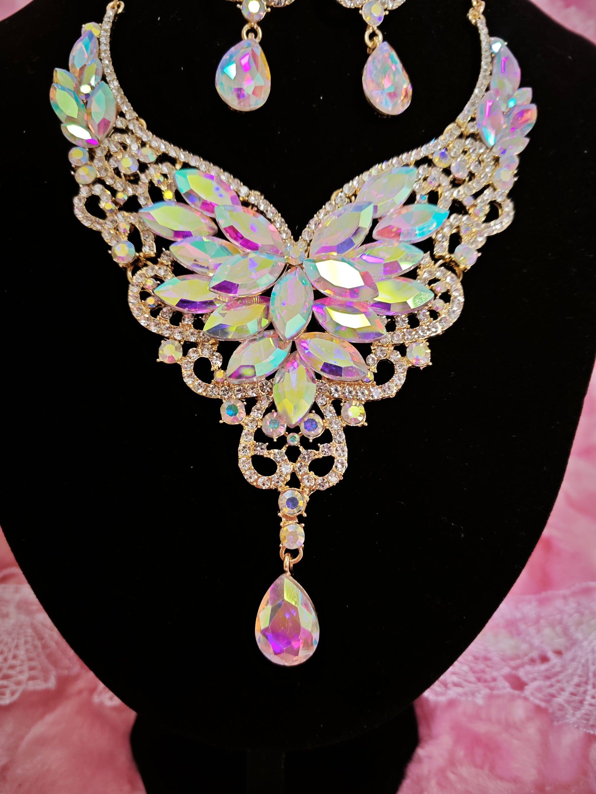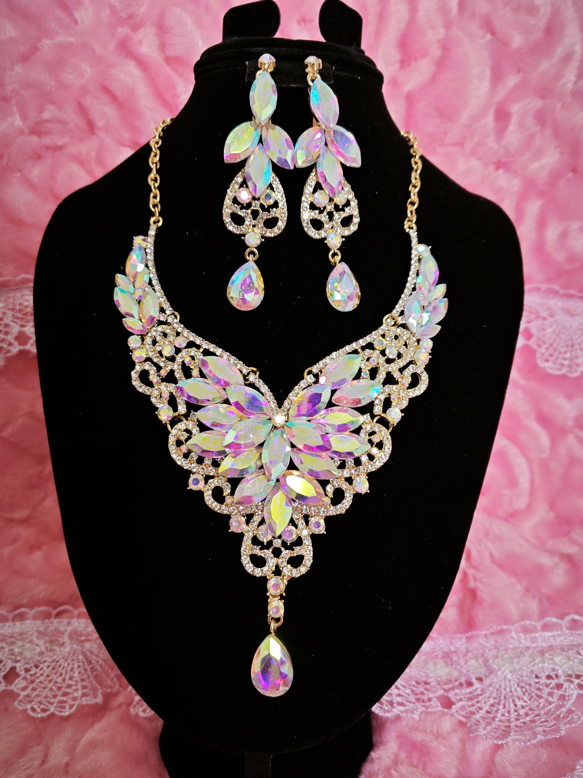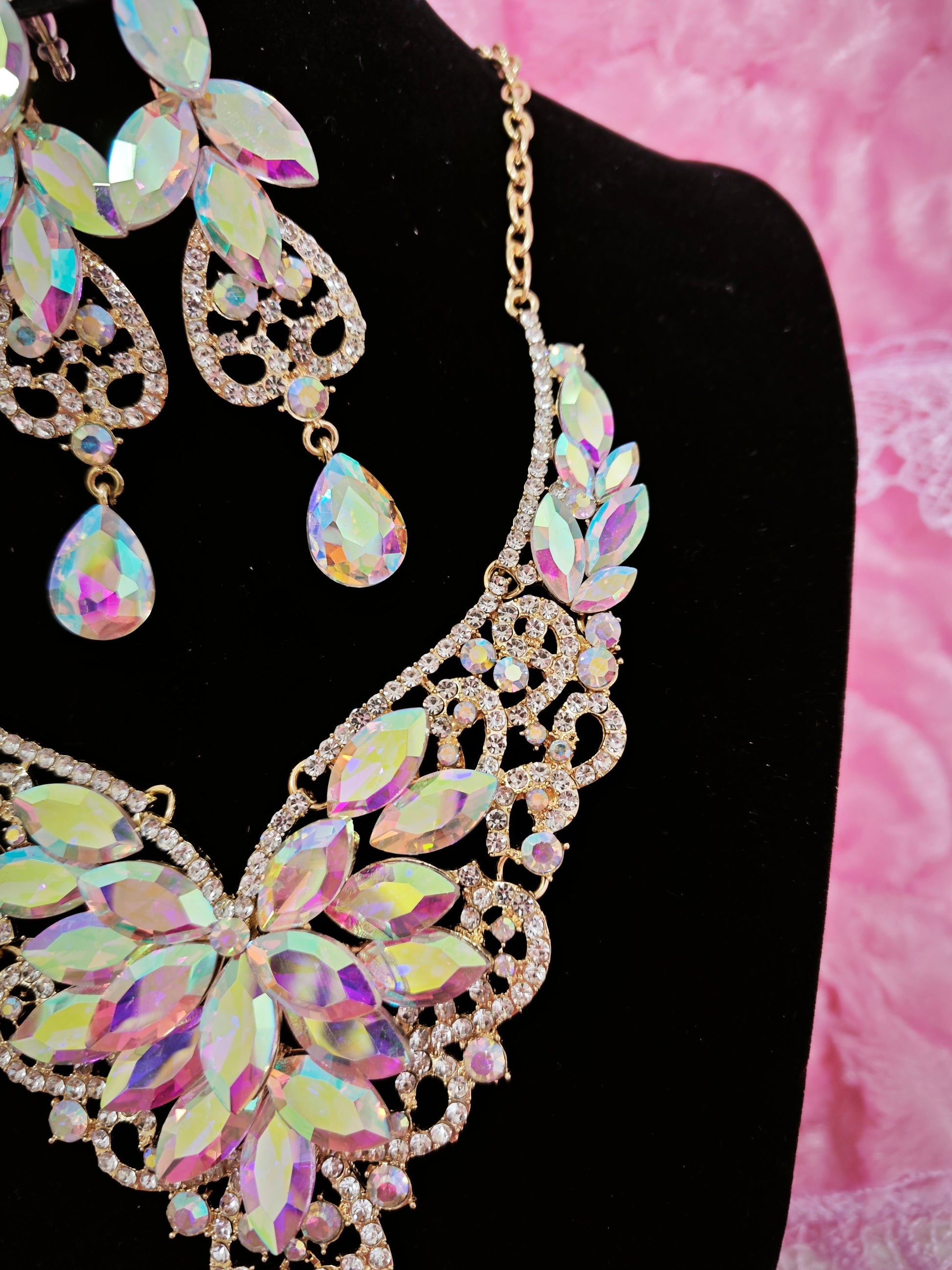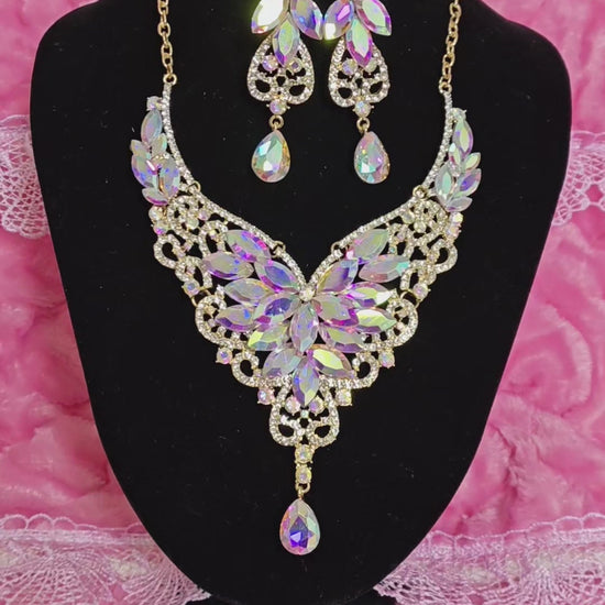 Gilded Iridescent Crystal Floral Necklace & Earring Set