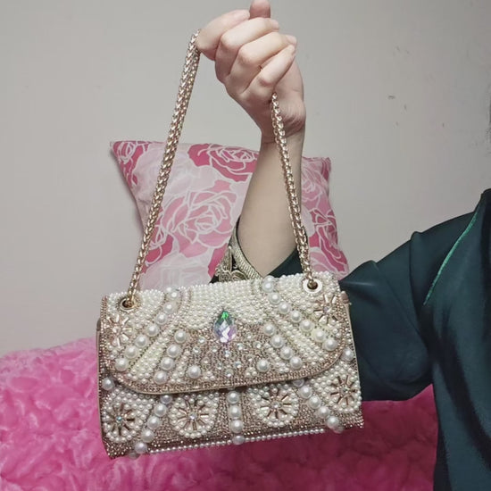 Crafted with high-quality pearl dense inlay technology and gold diamond inlay technology, the front features a luxurious visual effect with pearl argyle pattern and iridescent teardrop diamond embellishment technology. The bag body base is made of high-toughness soft fabric (flexible touch that can support the pearl and diamond shape), and the metal hardware adopts electroplated real gold technology for anti-oxidation and non-fading. Pearls and diamonds are fixed with firm hand dense nail technology, not easy to fall off. The base fabric has both scratch-resistant and tear-resistant properties, which not only retains the luxurious and shiny texture of the clutch bag, but also can maintain a delicate shape for a long time in daily use.