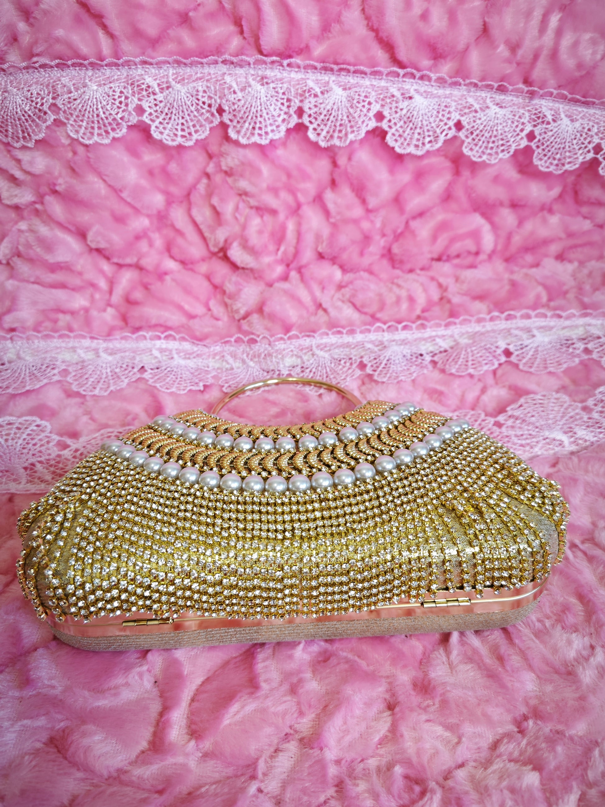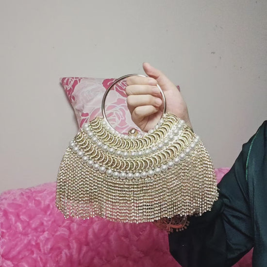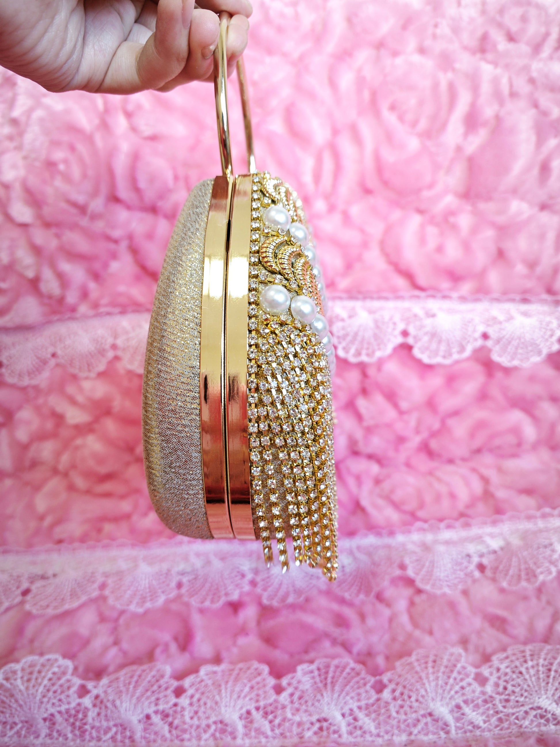 Gold Pearl & Crystal Tassel Hoop-Handle Evening Handbag