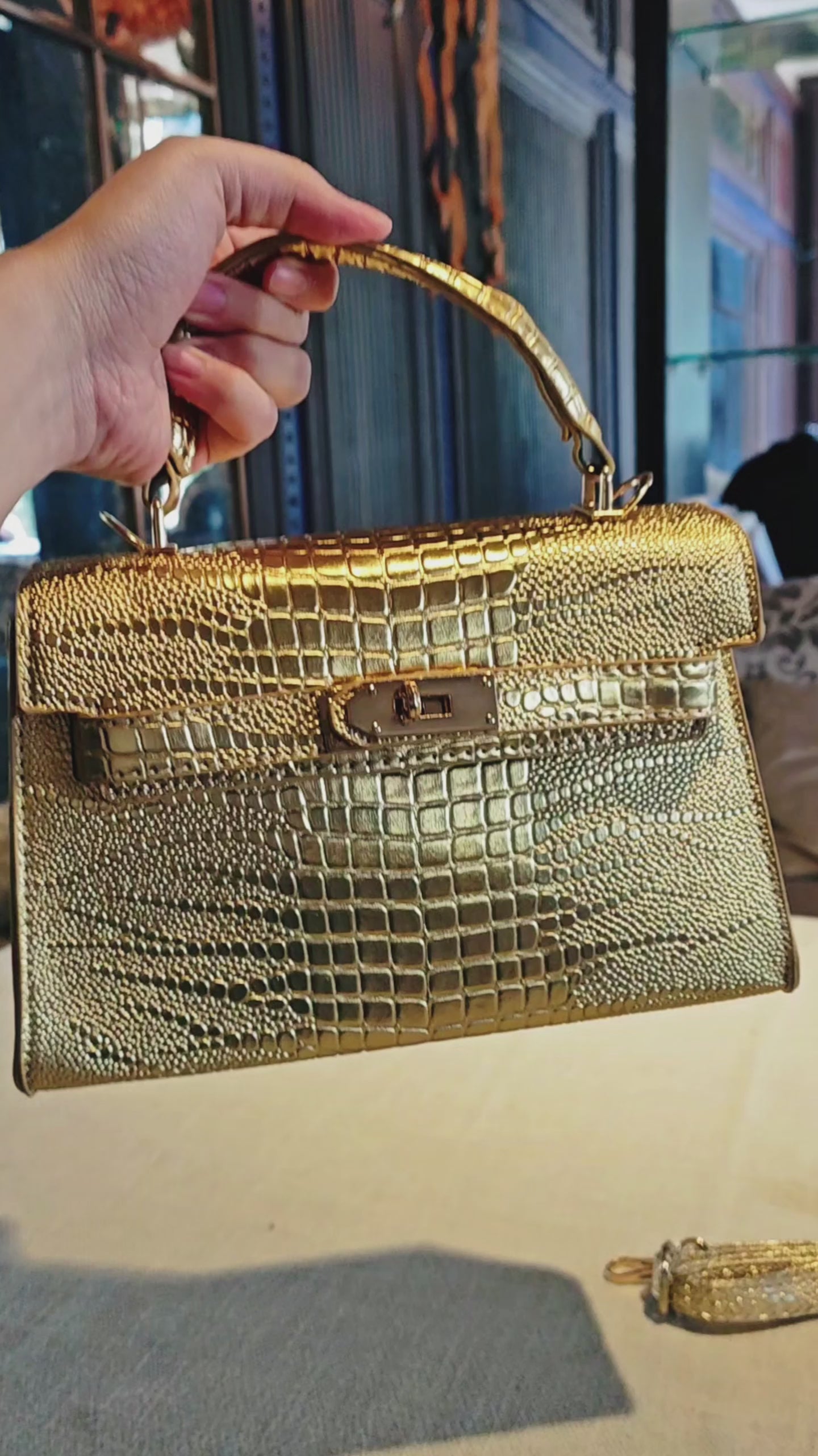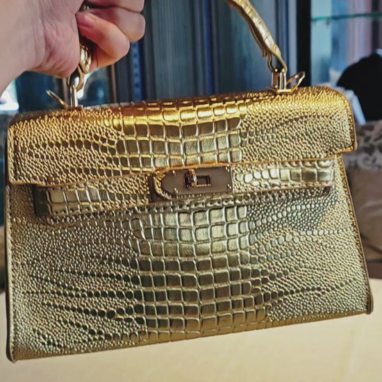 Based on a high-saturation bright gold base, paired with full-panel crocodile texture (created via embossing), the style is distinct and bold; the metal lock complements the leather’s luster, blending delicate details into a glamorous, eye-catching style — perfect for standout outfits.
