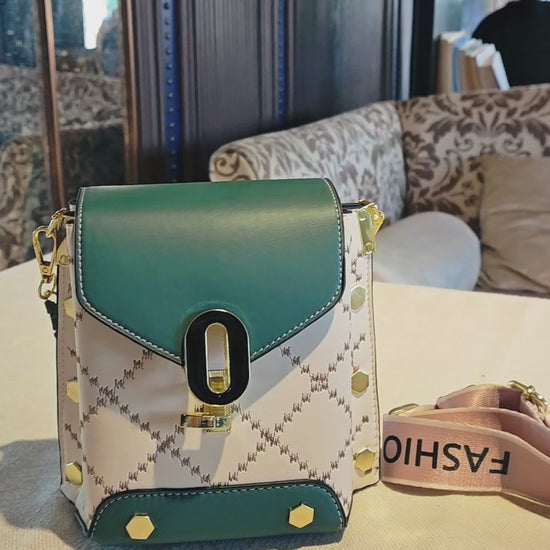 Centered on off-white base + gold diamond embroidery, the fine and neat lines add retro elegance to the bag; paired with dark green leather panels, black-glazed metal lock, and gold hexagonal rivets, the soft tones and metal details create a sweet-cool elegant vibe, suitable for gentle, light-retro and other diverse styling.