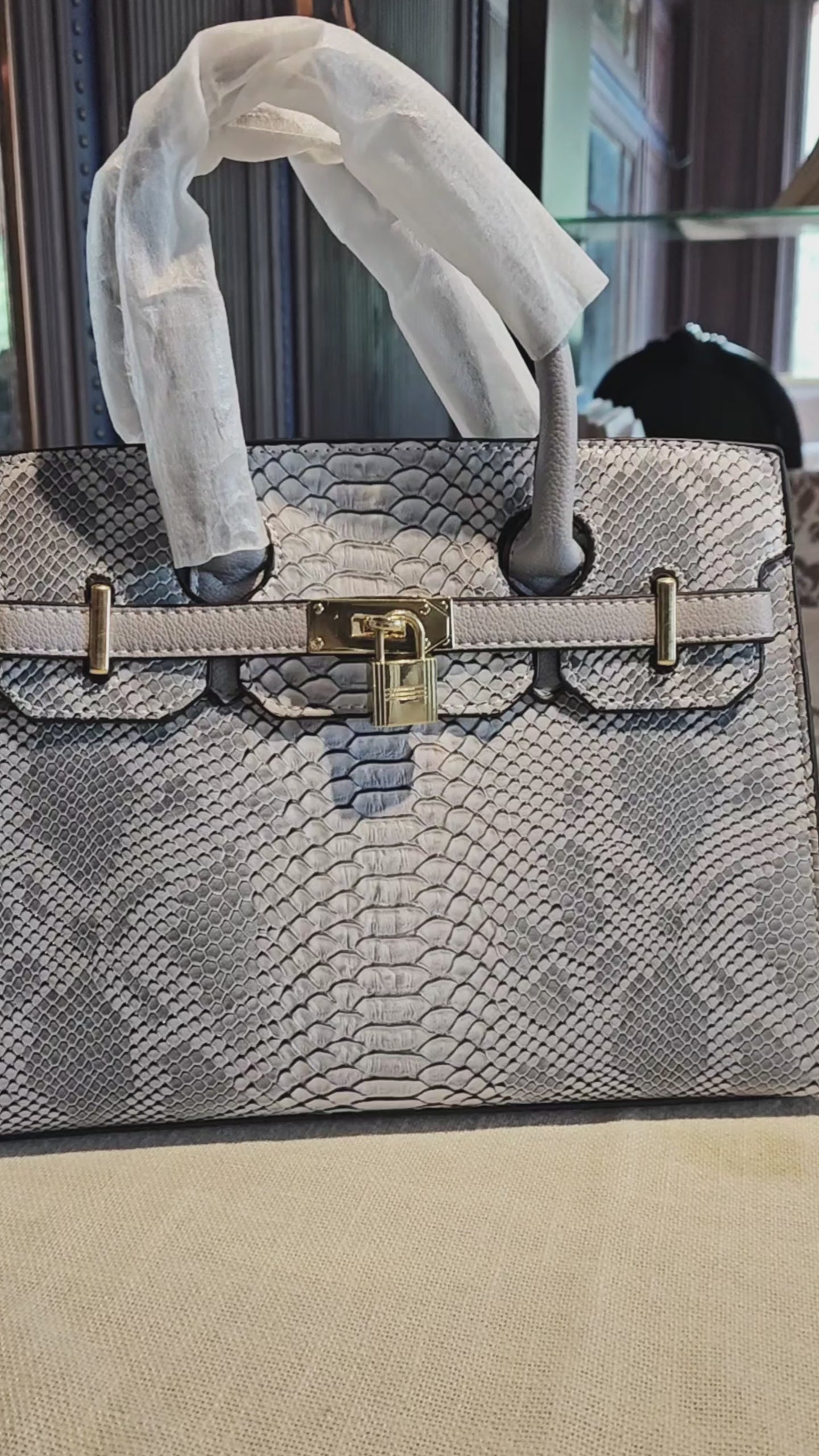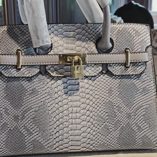 Grey Snakeskin-Embossed Birkin Style Handbag with Detachable Strap