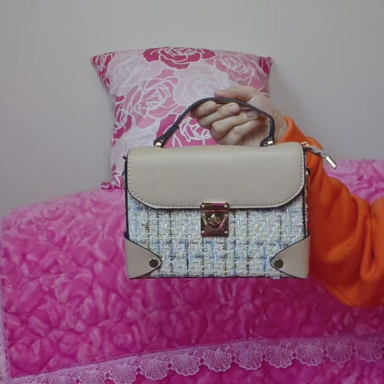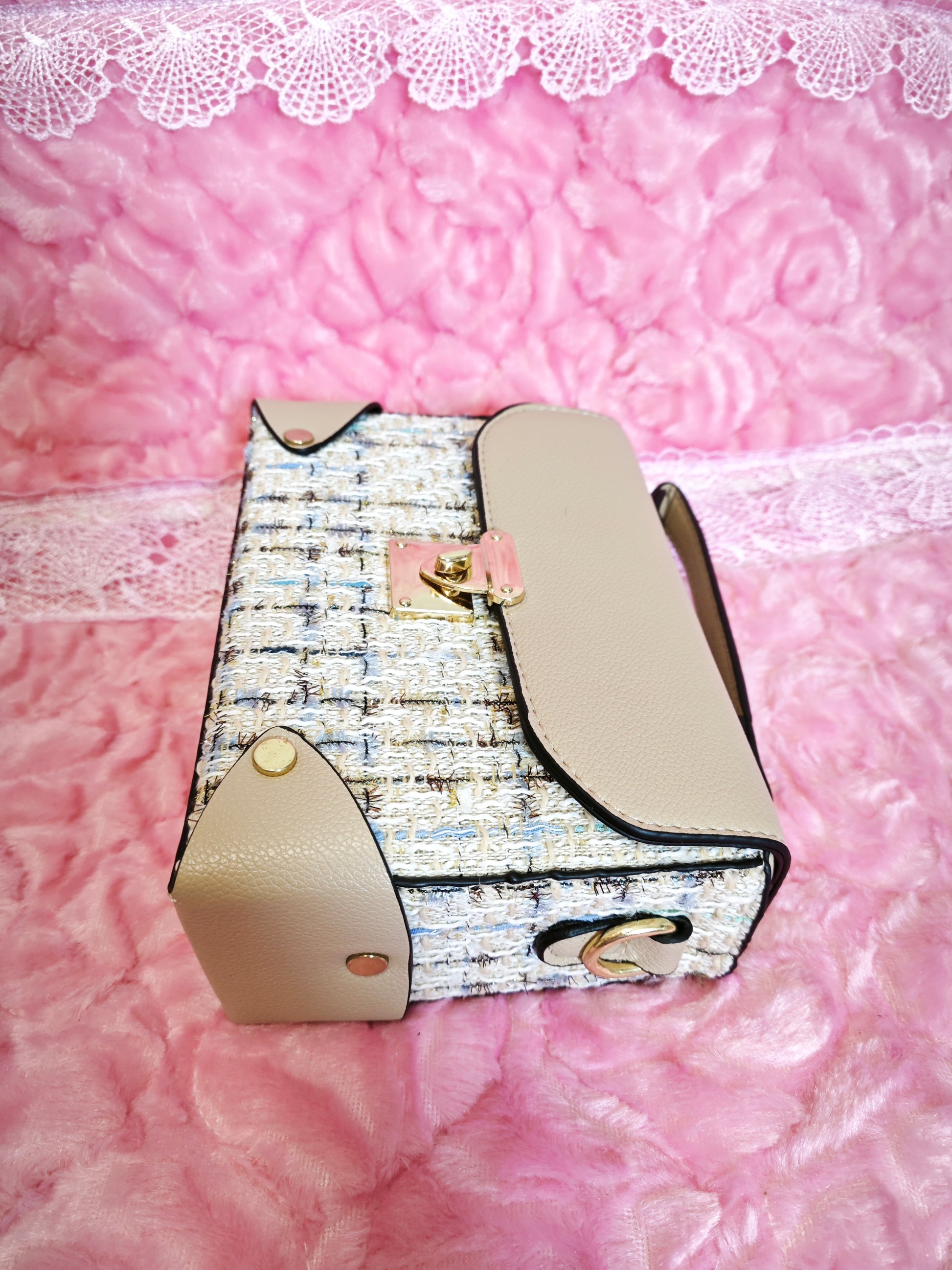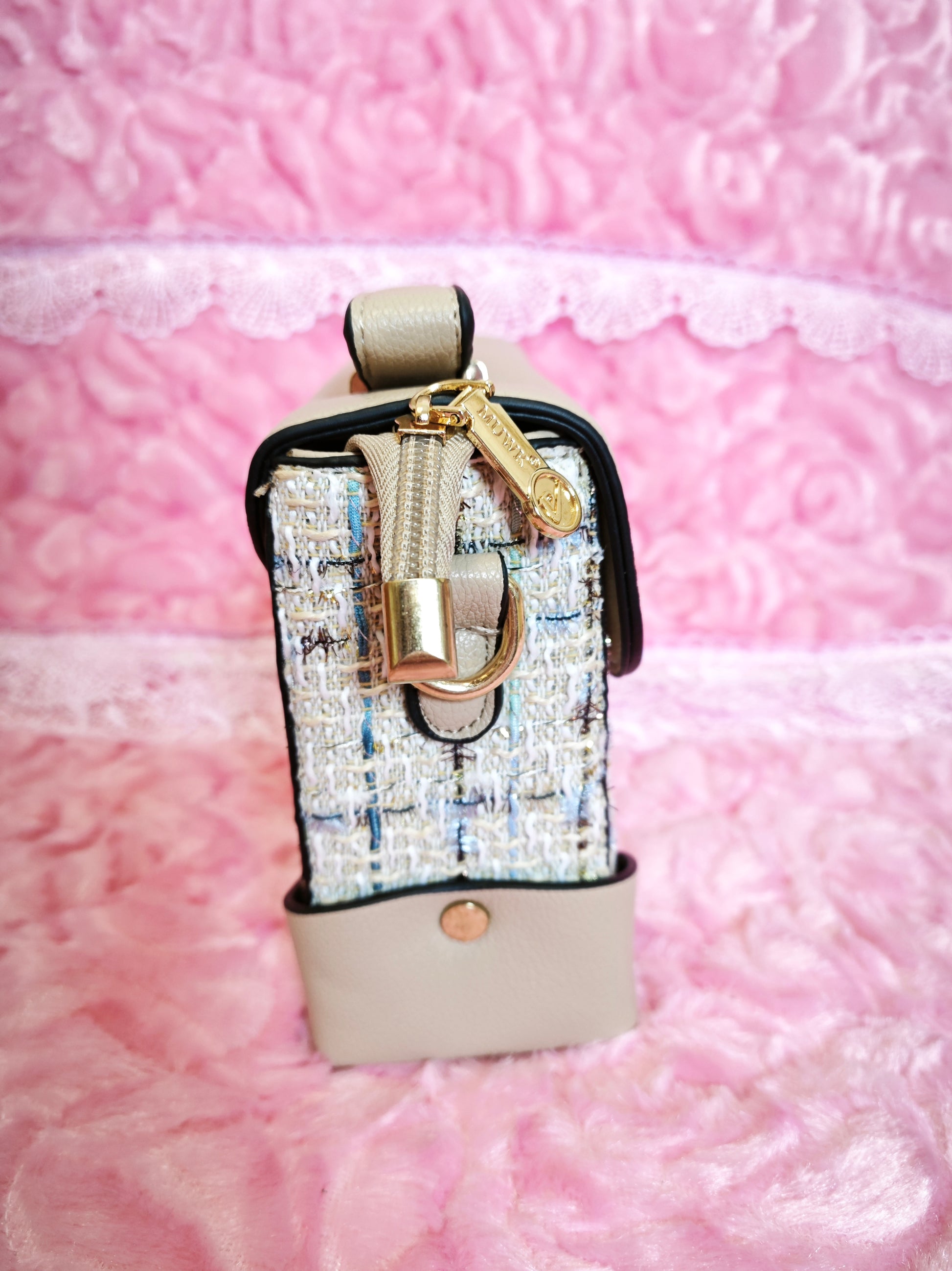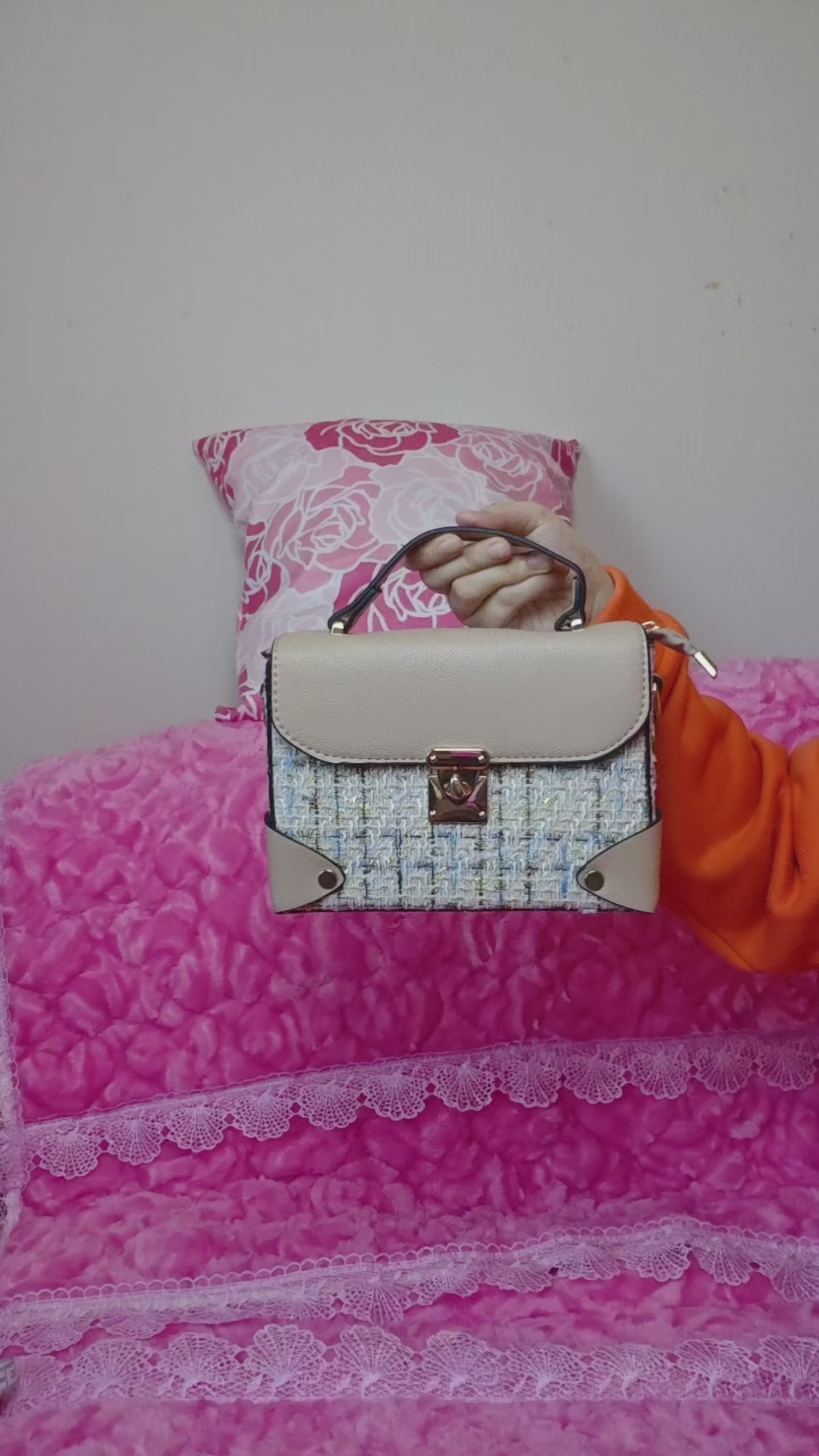 Sleek small square bag silhouette (neat and stiff lines), paired with "tweed weaving + lychee-pattern leather" color blocking as accents—it combines "soft mist light khaki base + tweed texture + gold lock"; the gentle khaki tone and retro weaving details collide to create a "French elegant light retro vibe"; the khaki bag body comes with a "gentle versatile filter," suiting commuting, dating and other style scenarios as an "exquisite atmosphere anchor" for outfits.