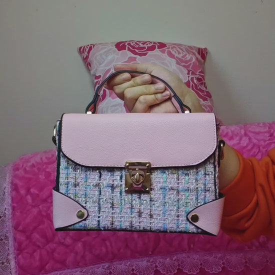 Sleek small square bag silhouette (neat and stiff lines), paired with "tweed weaving + lychee-pattern leather" color blocking as accents—it combines "cherry pink base + tweed texture + gold lock"; the sweet pink tone and retro weaving details collide to create a "French sweet light retro vibe"; the pink bag body comes with a "vibrant versatile filter," suiting commuting, dating and other style scenarios as a "sweet atmosphere anchor" for outfits.