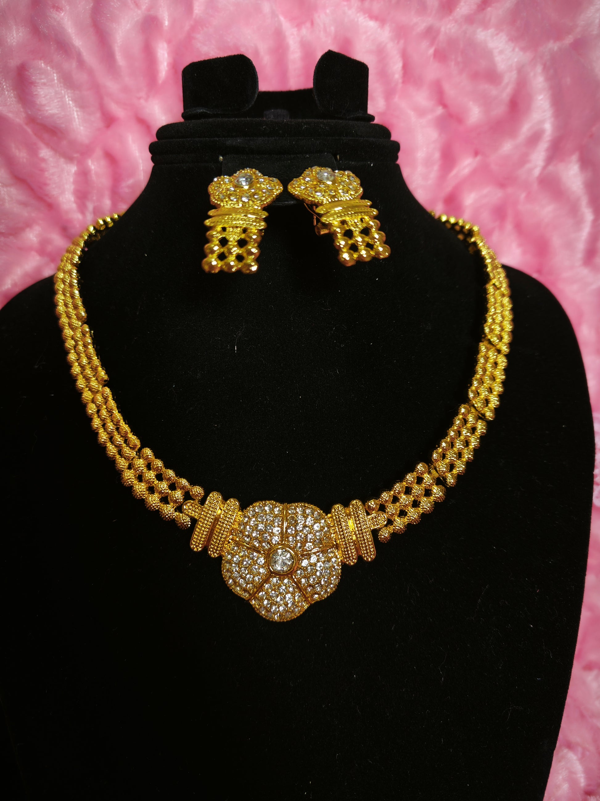 It adopts the Middle Eastern heavy industry gilded jewelry set design (three-dimensional and complicated lines with a Middle Eastern luxurious sense), highlighted by "filigree twisting base + white diamond pave setting main ornament". The combination of "gilded warm yellow metal luster + white diamond bright flash color contrast" creates a "Middle Eastern heavy industry + exotic luxurious style" with delicate filigree twisting texture and full gilded color. The four-piece set of necklace + bracelet + earrings + ring has a "grand ritual sense filter", and the shape is suitable for grand Middle Eastern weddings, high-end cultural celebrations, luxury theme banquets and other luxurious style scenarios, making it the "luxurious core" of the outfit.