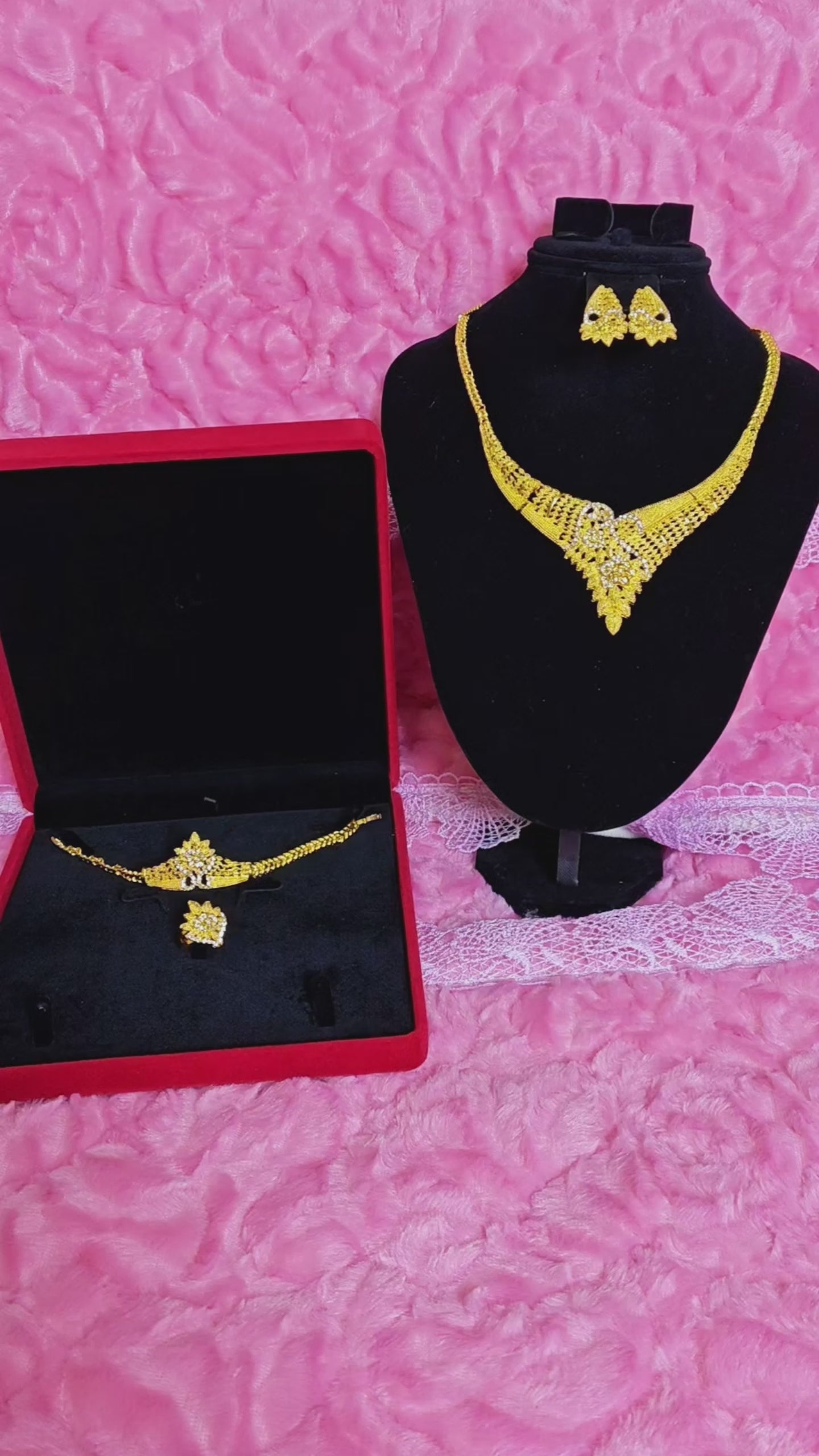 It adopts the Middle Eastern rhombic pattern heavy industry gilded jewelry set design (three-dimensional and neat shape with a Middle Eastern light luxury sense), highlighted by "rhombic pattern embossment base + white diamond pave setting main ornament". The combination of "gilded warm yellow metal luster + white diamond bright flash color contrast" creates a "Middle Eastern rhombic pattern + light luxury luxurious style" with delicate rhombic pattern embossed texture and full gilded color. The four-piece set of necklace + bracelet + earrings + ring has a "noble ritual sense filter", and the shape is suitable for high-end Middle Eastern weddings, rhombic pattern theme celebrations, luxury business dinners and other noble style scenarios, making it the "light luxury core" of the outfit.
