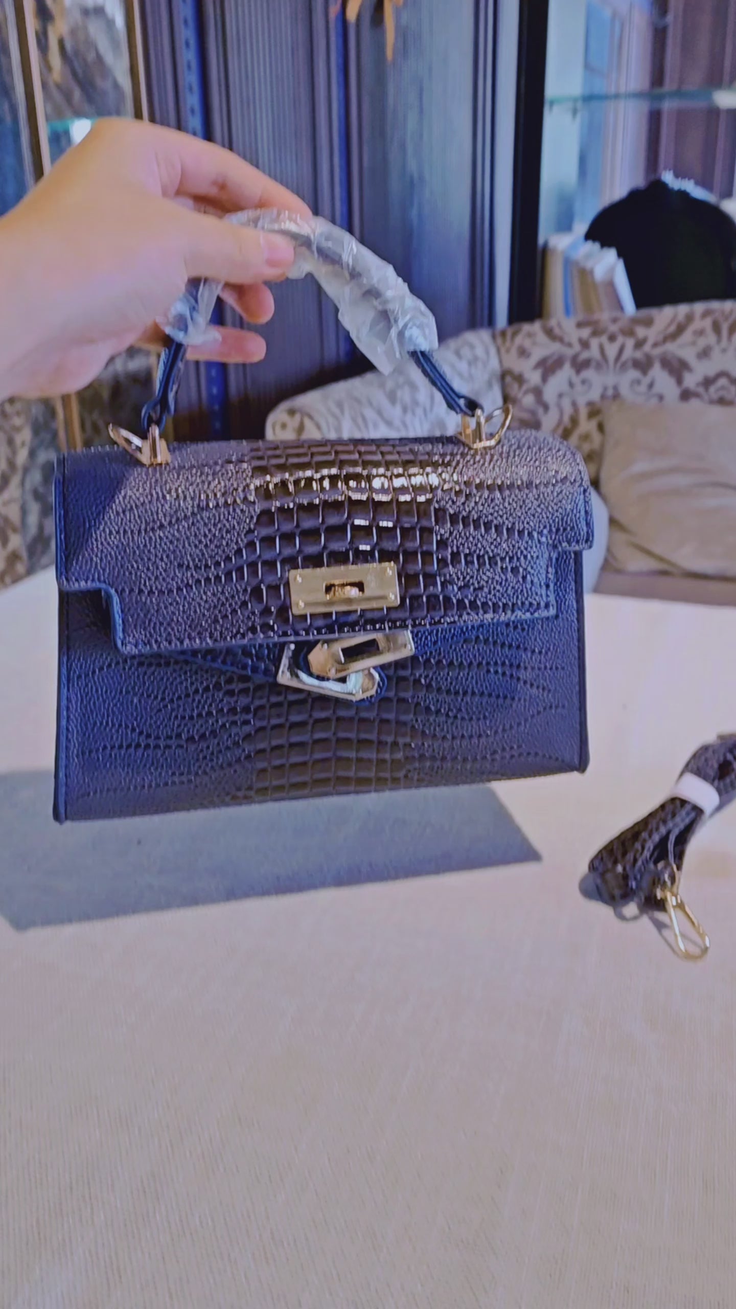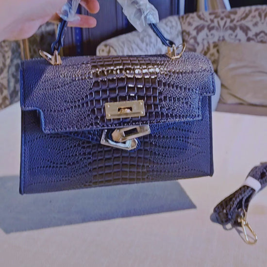 Navy Blue Crocodile-Embossed Mini Kelly Style Handbag with Detachable Strap