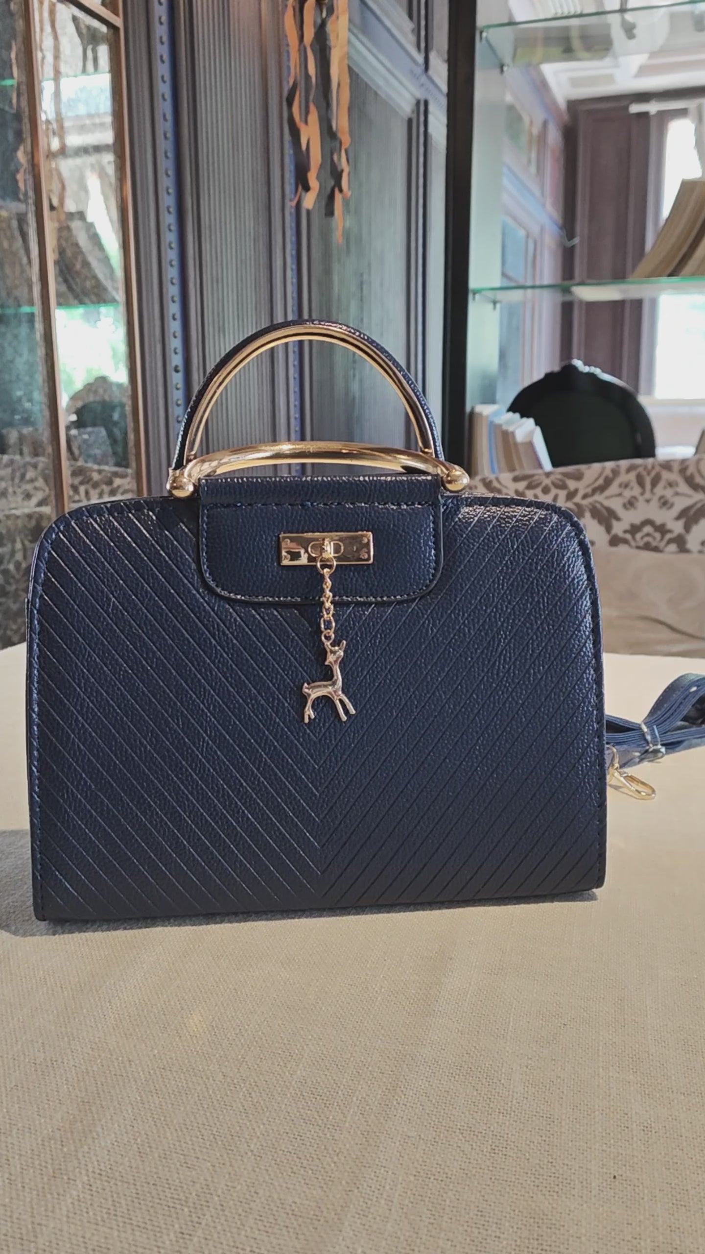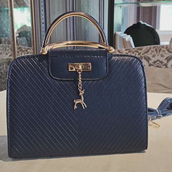 Navy Blue Textured Top-Handle Boston Bag with Golden Deer Charm and Detachable Strap