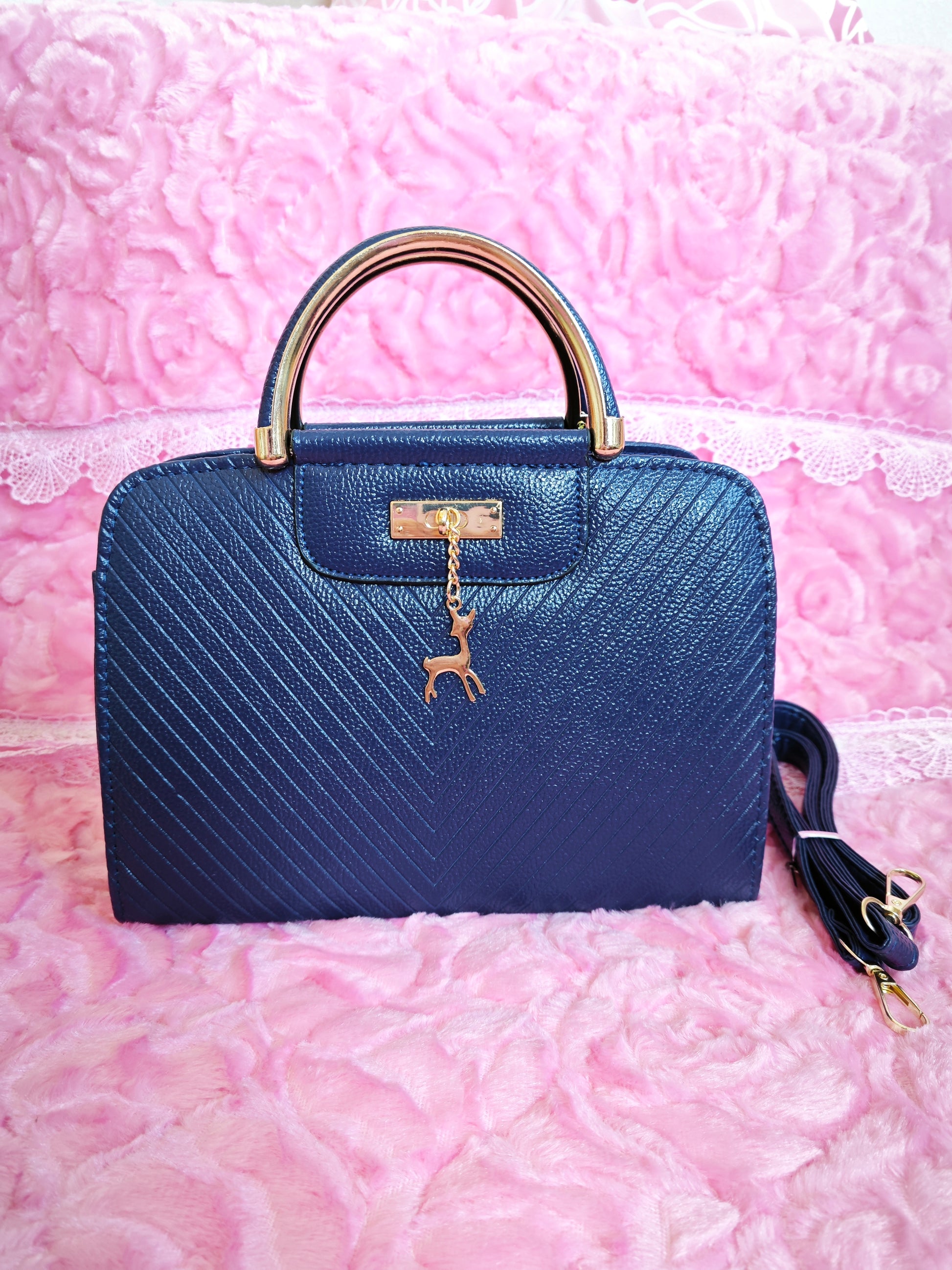 Made of high-quality premium fabric (delicate and flexible texture, comparable to genuine leather), finished with "diagonal pattern embossing + lychee pattern splicing technology"—the navy blue version adopts "velvet navy blue texture technology"; the deep navy blue base is combined with diagonal pattern and lychee pattern splicing, retaining the fabric's scratch-resistant and wear-resistant properties while adding light luxury layers with "metal ring handle + gold hardware + deer pendant"; the texture is close to genuine leather and long-lasting, resisting deformation and fading in daily use; the black version adopts "deep jet-black texture technology", with a pure jet-black base combined with the same splicing texture, paired with silver hardware, creating a calm texture, and the fabric is lightweight and dirt-resistant for long-term use without aging.