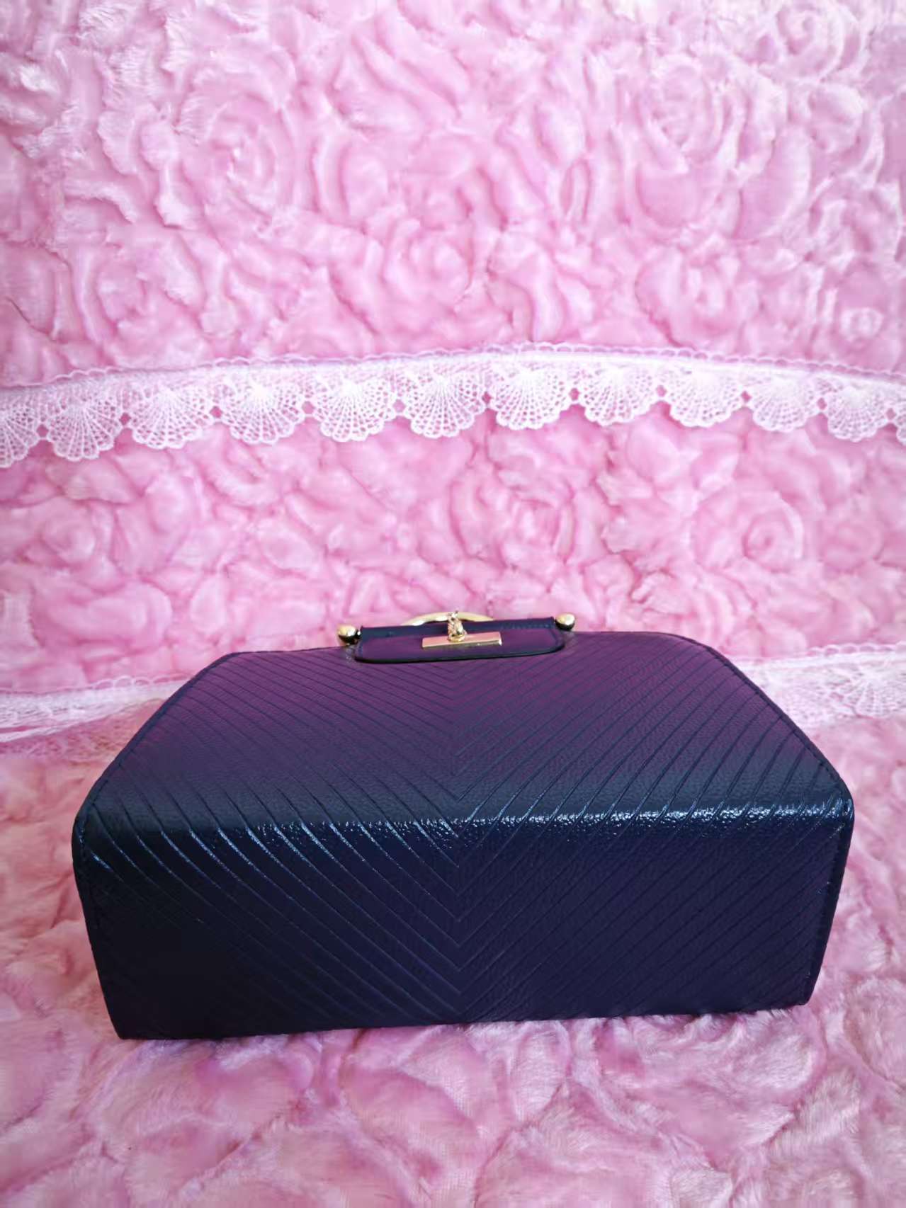 Classic structured handbag silhouette (round and stiff lines), paired with "diagonal pattern + lychee pattern splicing texture + metal ring handle" as accents—the navy blue version combines "velvet navy blue base + splicing texture + gold hardware"; the calm elegance of navy blue collides with the exquisite details of the texture to create an "intellectual light luxury style"; the navy blue bag body comes with a "high-end atmosphere filter", suiting workplaces, dinners, daily outings and other style scenarios as a "temperament texture anchor" for outfits; the black version creates a "minimalist light luxury commuter style", which is a versatile workplace tool.