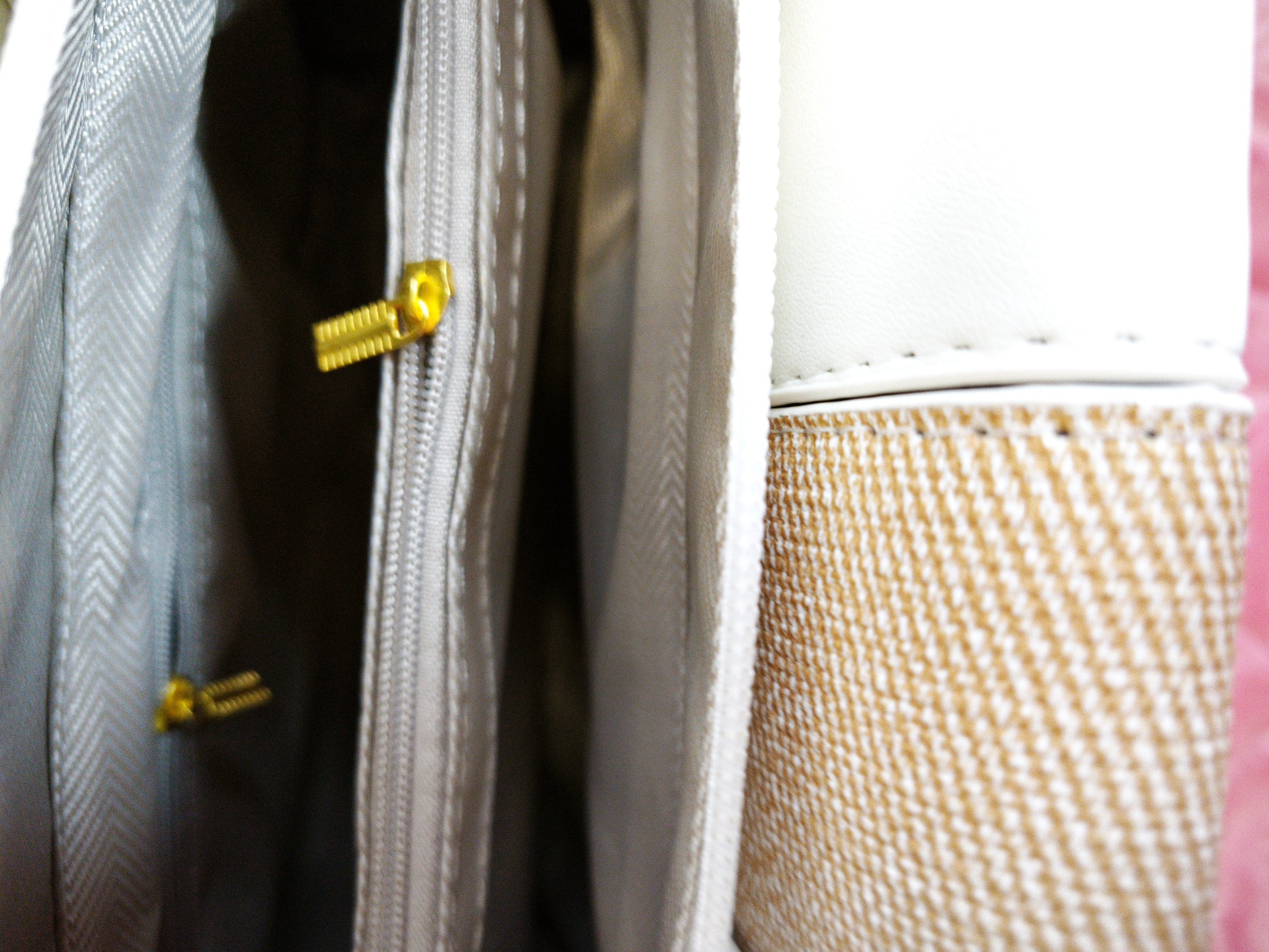 Made of high-quality soft-grain leather and woven fabric splicing (delicate and stiff texture, restoring genuine leather feel), crafted with "color-block material splicing technology"—the white version adopts "milk white color-block texture technology"; the pure milk white leather is combined with light khaki woven fabric splicing, retaining the fabric's wear-resistant and scratch-resistant properties while outlining a light luxury layering with "gold metal buckle + chain decoration"; the texture is comparable to genuine leather with long-lasting three-dimensional texture, resistant to pilling and yellowing in daily use.