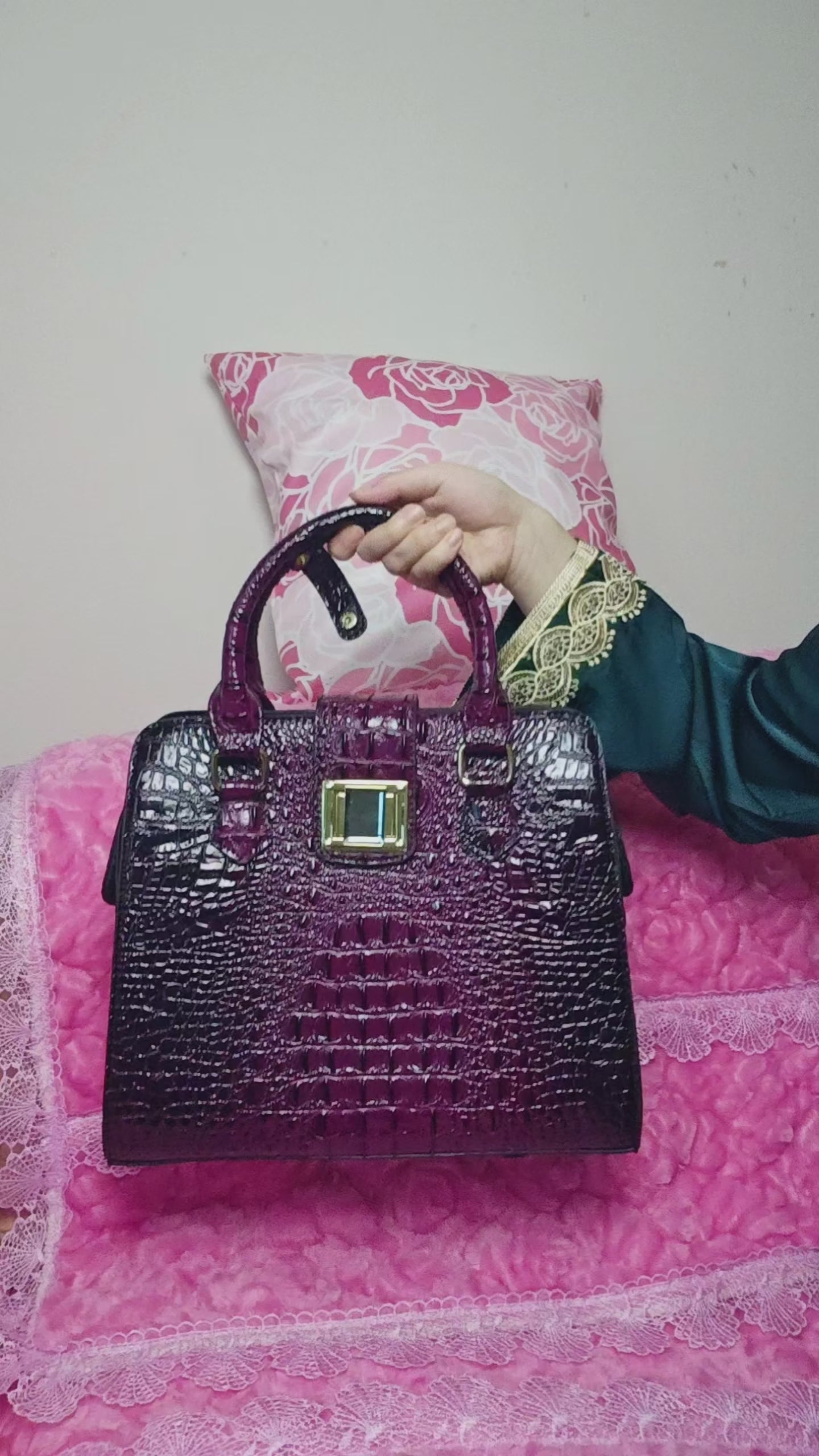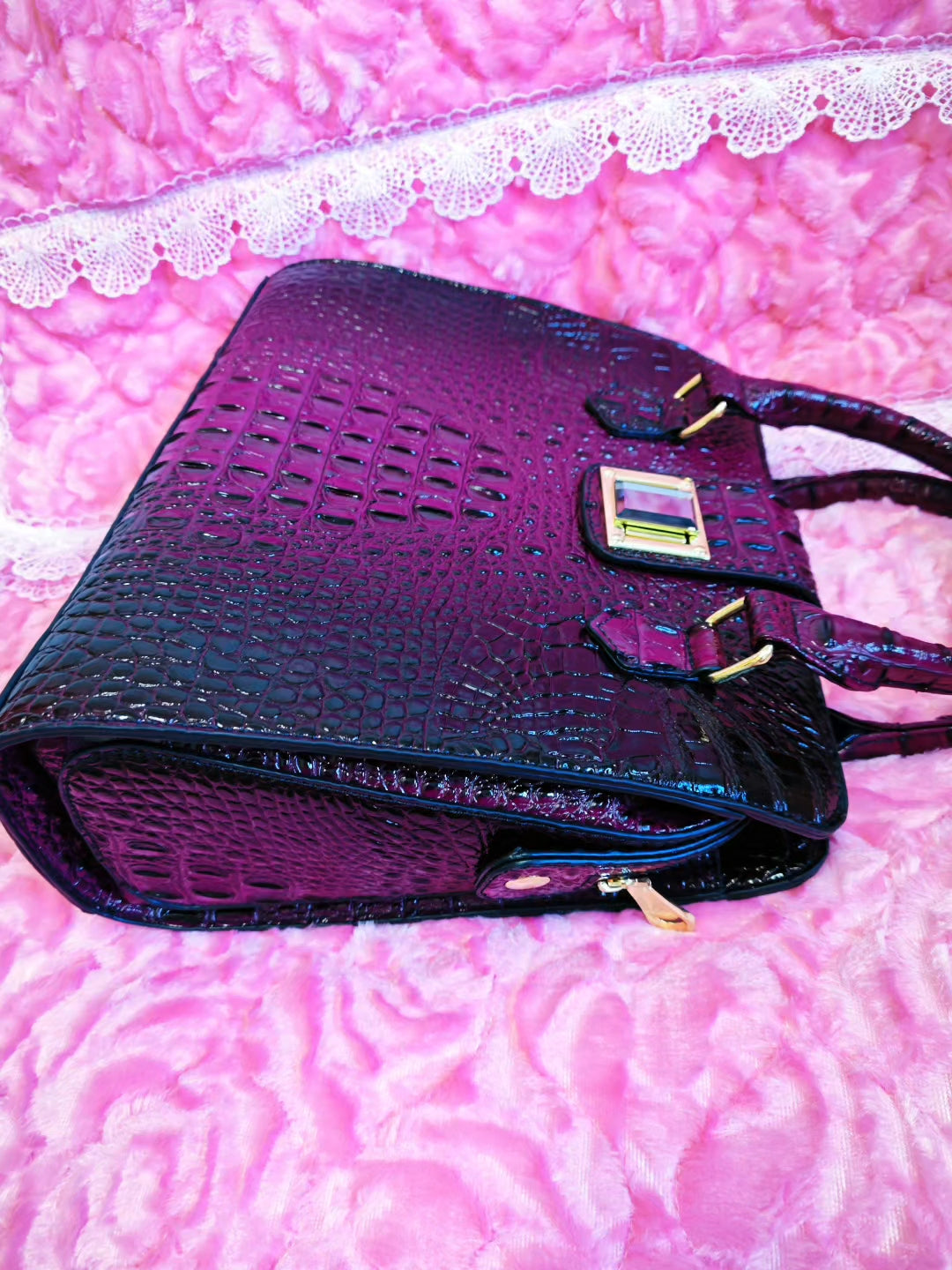 Full-panel precision-engraved crocodile patterns, with layered textures mimicking the natural grain of genuine leather; paired with stone-inlaid gilded hardware accessories as accents—the grand tension of retro crocodile patterns collides with the brilliance of gilded metal to create a "vintage purple genuine leather light luxury vibe"; the solid vintage purple crocodile pattern comes with an "elegant opulent filter," suiting banquet appointments, daily outings, etc.—it’s a "rich high-end texture anchor" for outfits.