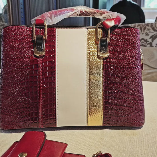 Red Crocodile-Embossed Color-Block 3-Piece Bag Set with Detachable Strap