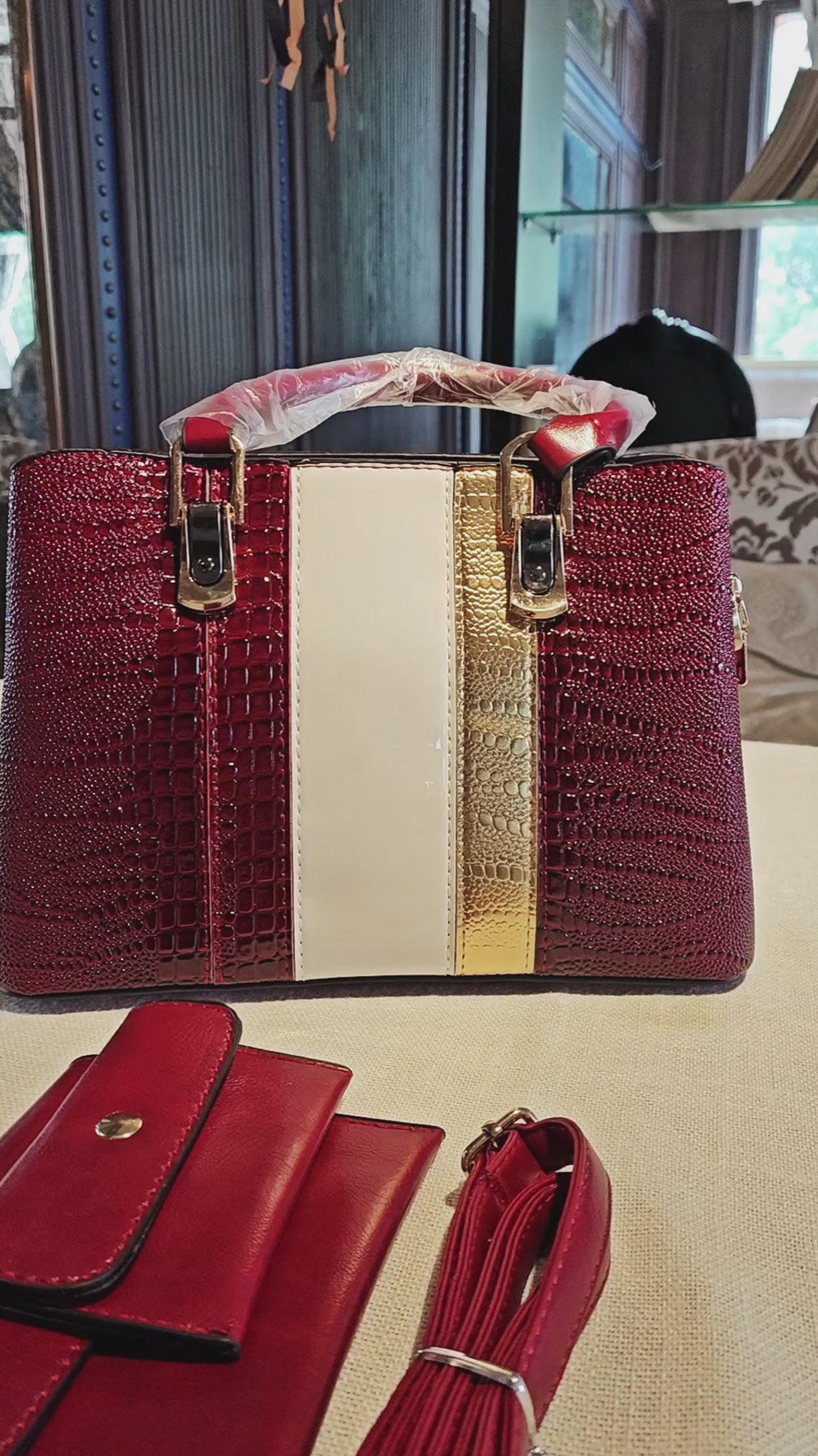Made of high-gloss crocodile-patterned PU leather with color-blocking design: the main body features wine red crocodile texture, paired with white/gold striped details, combining the luxury of simulated exotic leather with scratch resistance and durability; the material has a bright, full luster, and the rich wine red base is upscale, resisting fading and oxidation, balancing striking visual layers and long-term sophistication.