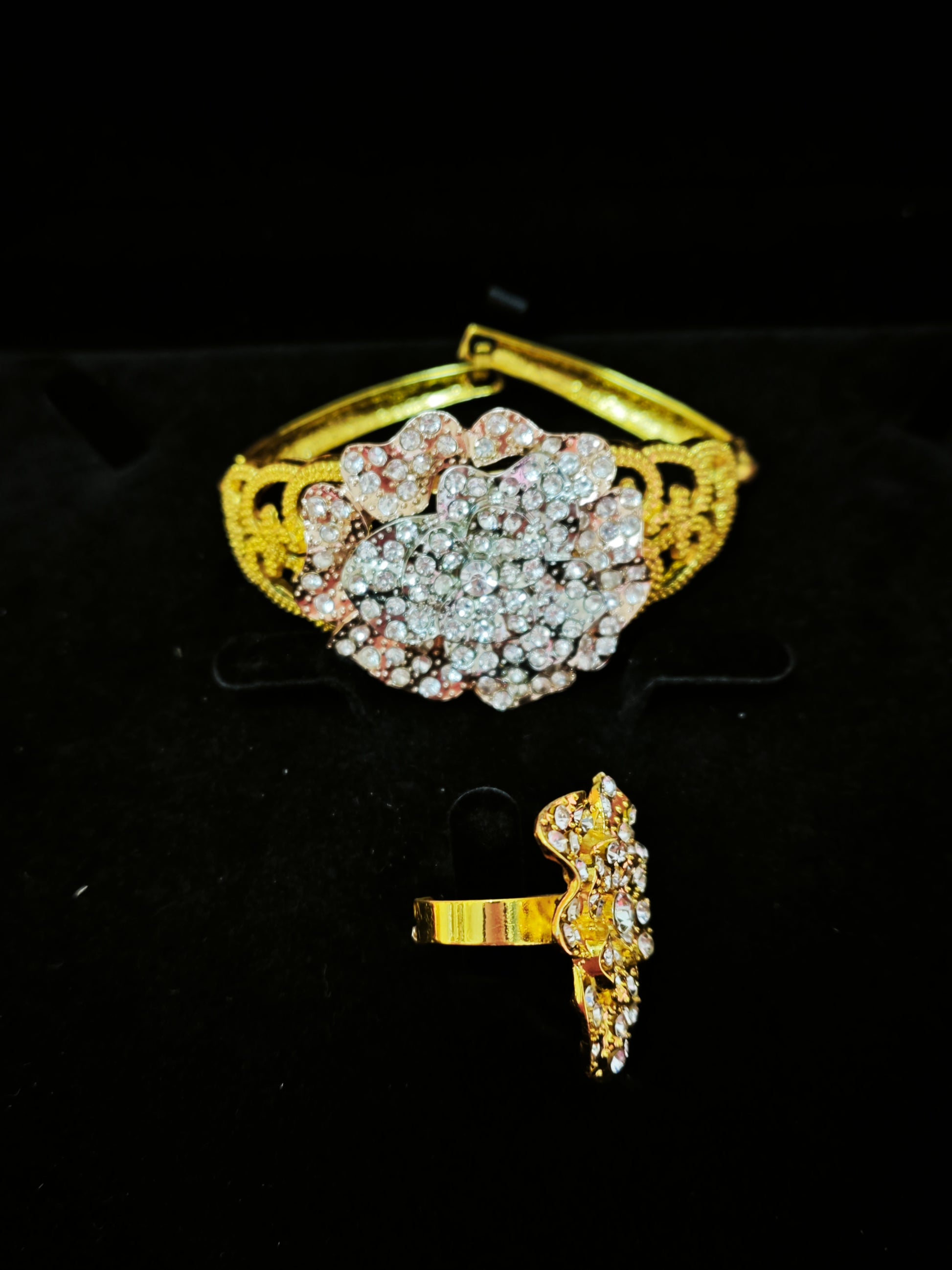 Crafted with high-quality copper alloy material combined with relief forging and pave setting technology, the front takes three-dimensional flower cluster shapes as the core and adopts integrated forging forming technology to present a gorgeous and exquisite visual effect. The metal base is made of copper alloy (light texture and wear-resistant), the flower cluster relief technology adopts mechanical carving + manual polishing, with three-dimensional lines and strong layering; the copper alloy is treated with multi-layer gold-plated coating, which has both anti-oxidation and anti-fading properties. The edges of the flower cluster and the pave-set diamond parts are smoothly polished, which not only retains the artistic texture of heavy industry jewelry, but also avoids scratching the skin during wearing. The total weight of the set is about 105g (with manual measurement error).