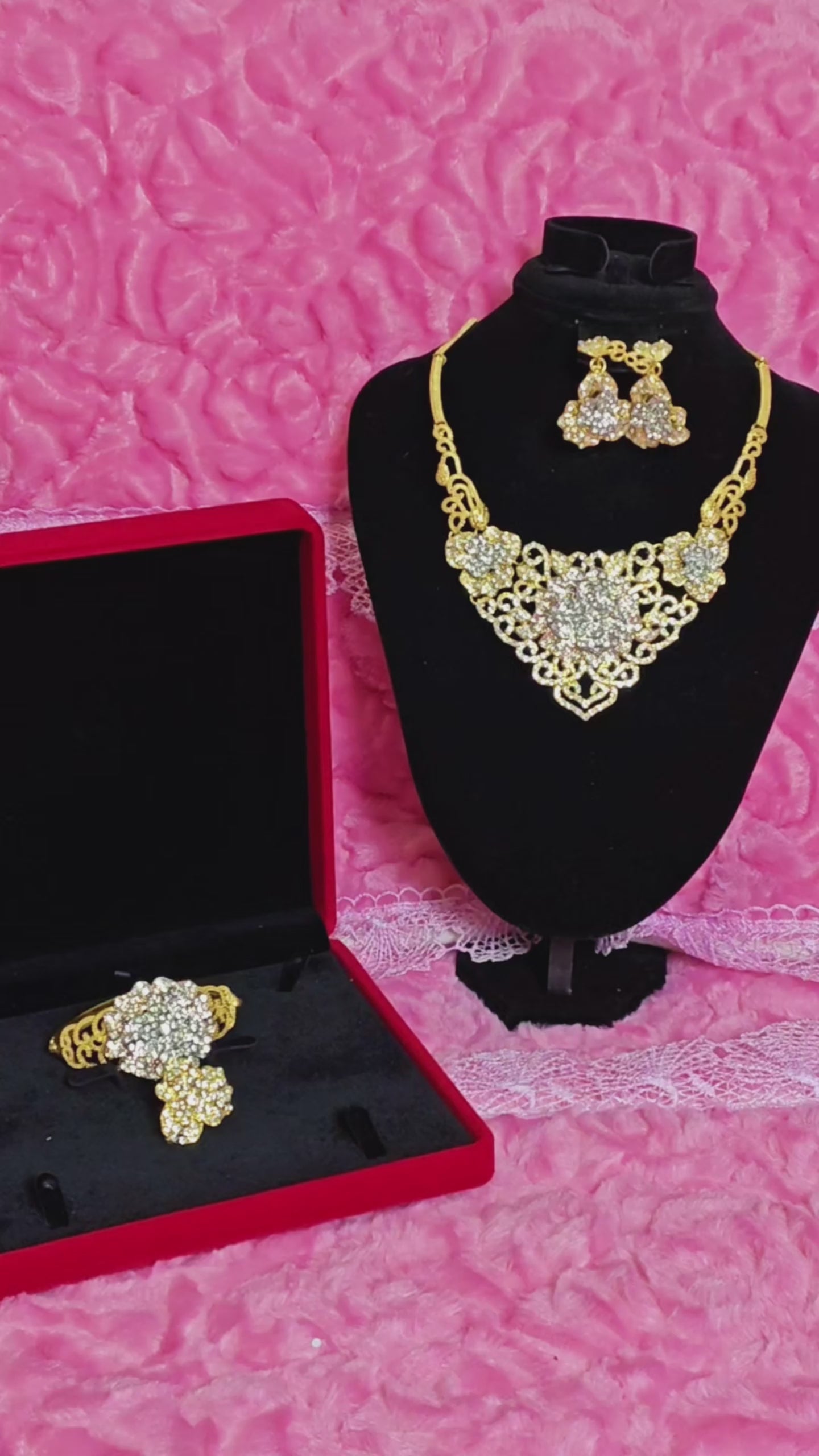 It adopts the heavy industry gilded four-piece jewelry set design with flower cluster full diamonds (necklace + earrings + bracelet + ring), with a three-dimensional and bright shape that exudes light luxury artistic sense, highlighted by "flower cluster relief + full diamond pave setting + hollow chain". The combination of "bright gilded gold metal luster + texture hierarchy of flower cluster relief + bright texture of white diamonds" creates a "light luxury heavy industry + flower cluster shining style" with full flower cluster texture and smooth gilded color. The four-piece set has a "gorgeous ritual sense filter", and the shape is suitable for various gorgeous style scenarios such as European weddings, high-end dinners and luxury celebrations, making it the "gorgeous core" of the outfit.