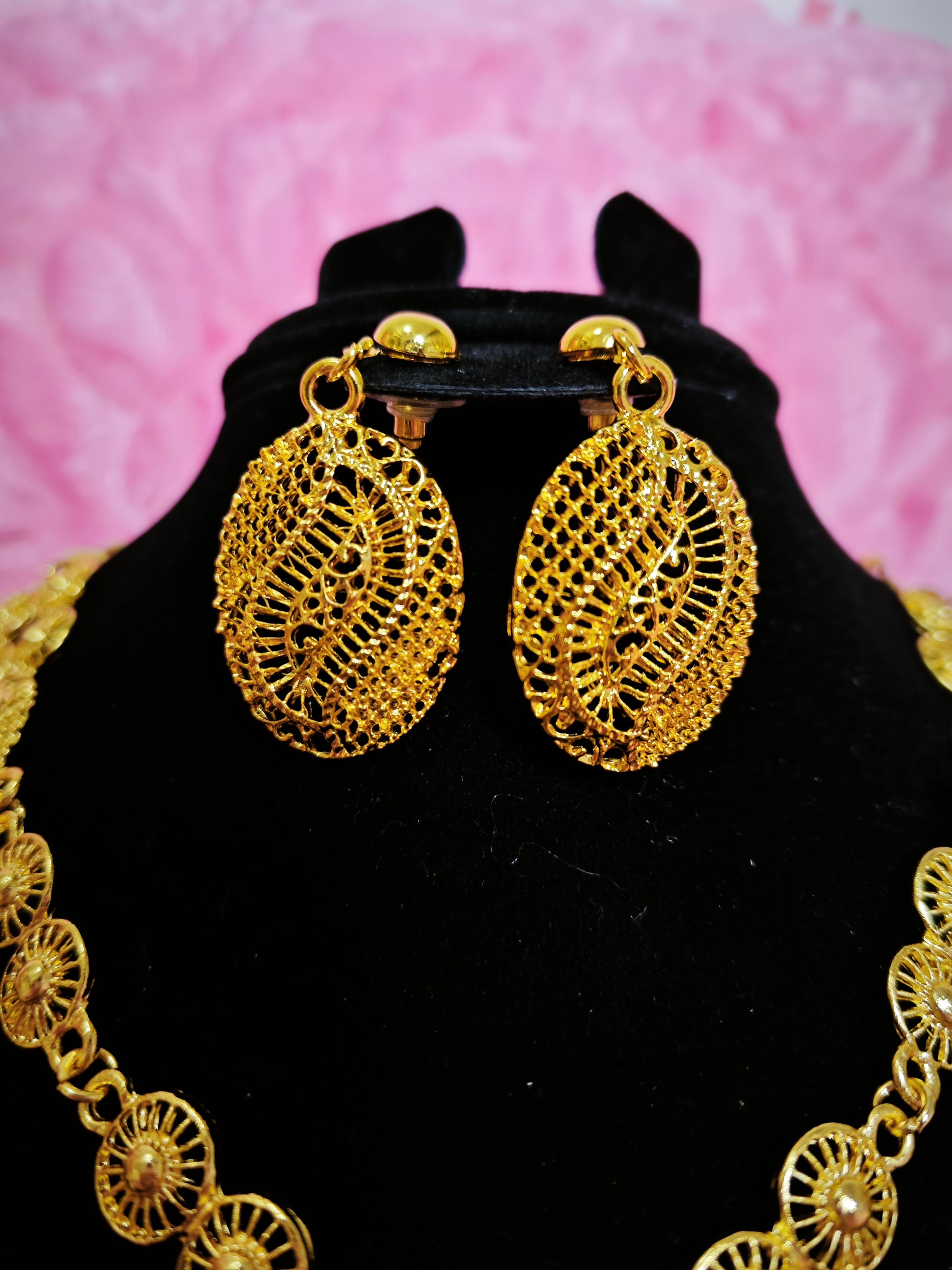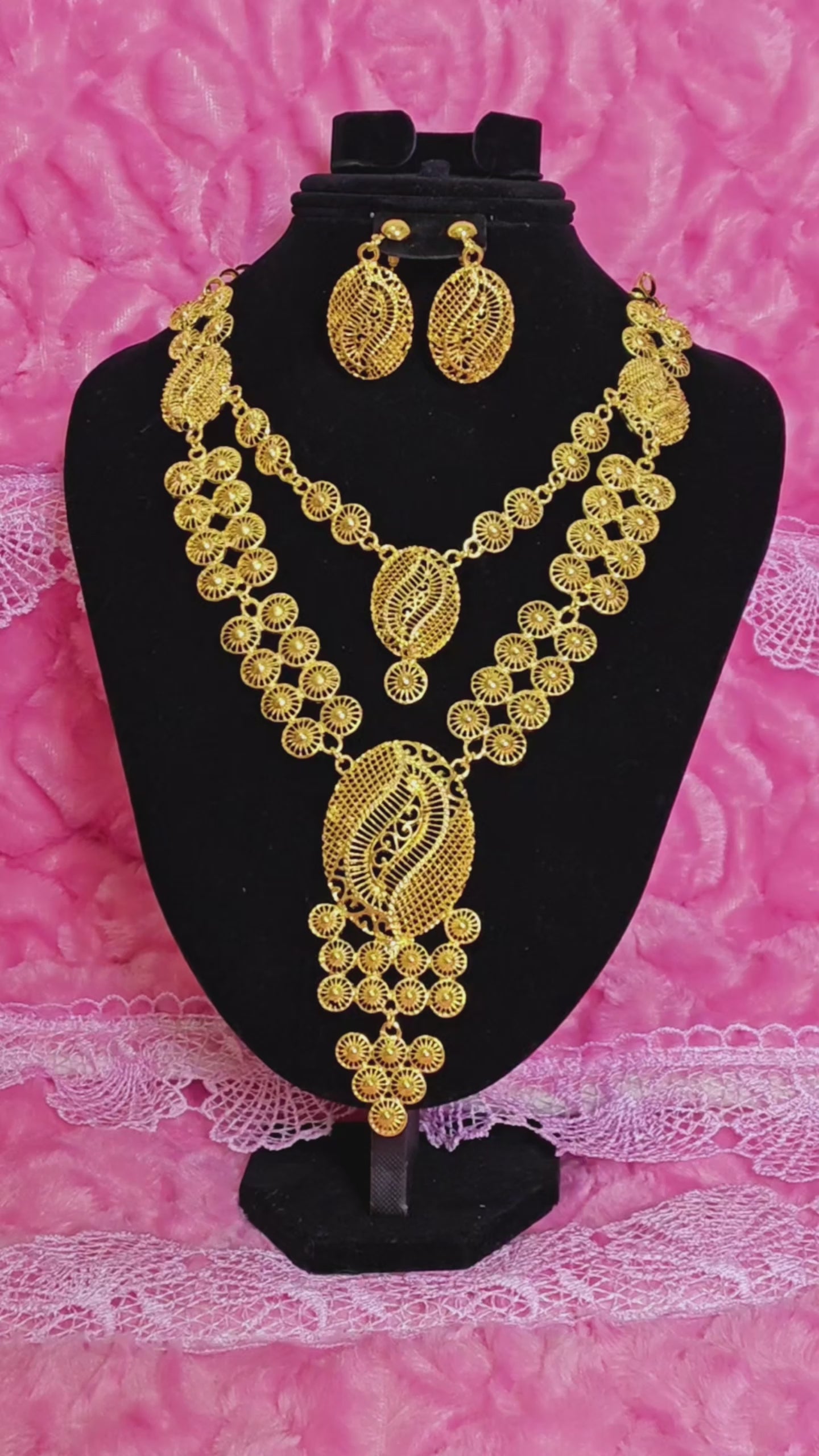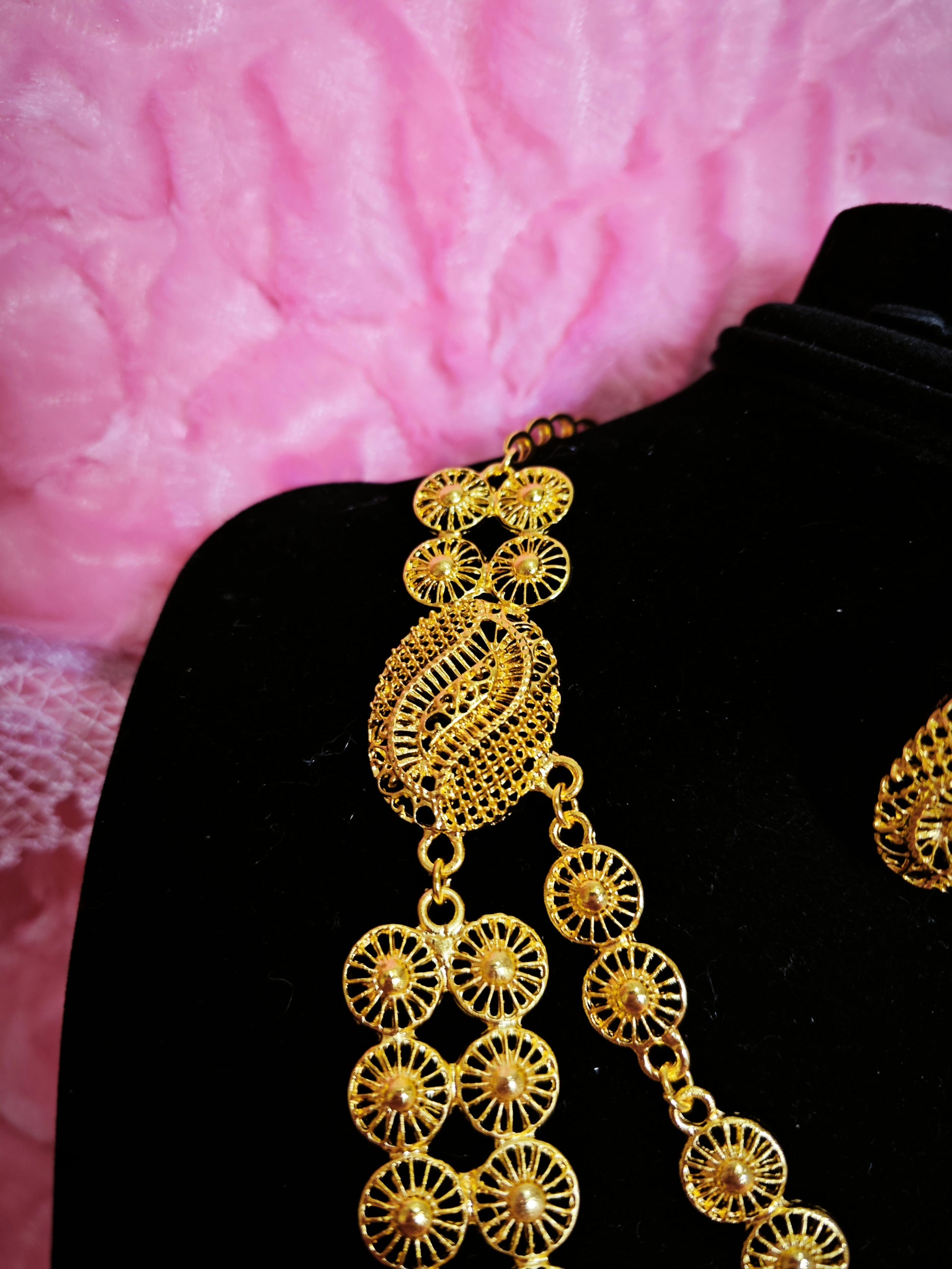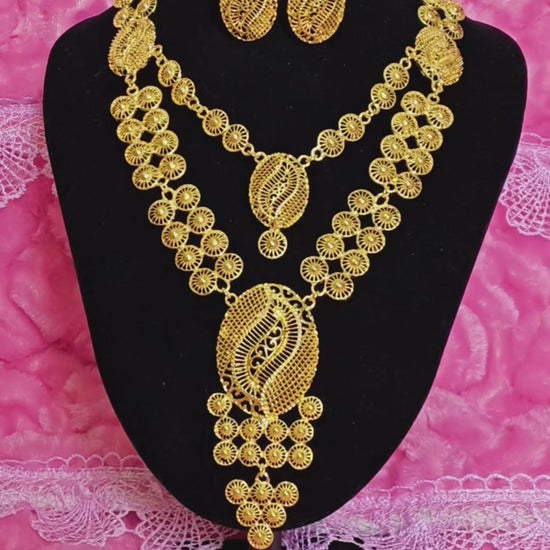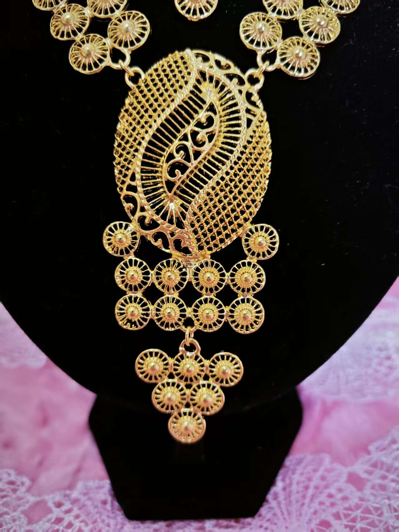It adopts the Middle Eastern filigree hollow heavy industry gilded jewelry set design (light and transparent shape with a Middle Eastern artistic sense), highlighted by "filigree hollow flower shape + multi-layer chain layering". The combination of "bright gilded yellow metal luster + texture hierarchy of filigree hollow" creates a "Middle Eastern filigree + exotic artistic style" with delicate filigree weaving texture and full gilded color. The two-piece set of necklace + earrings has an "artistic ritual sense filter", and the shape is suitable for Middle Eastern folk celebrations, exotic theme weddings, luxury cultural dinners and other artistic style scenarios, making it the "artistic core" of the outfit.