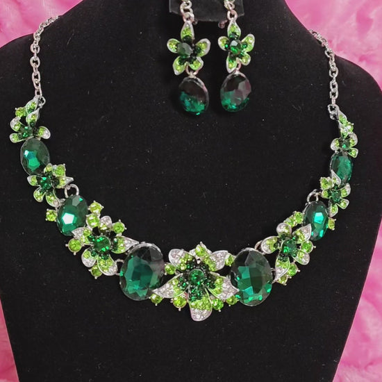 Silver Green Gem Floral Cluster Necklace & Earring Set