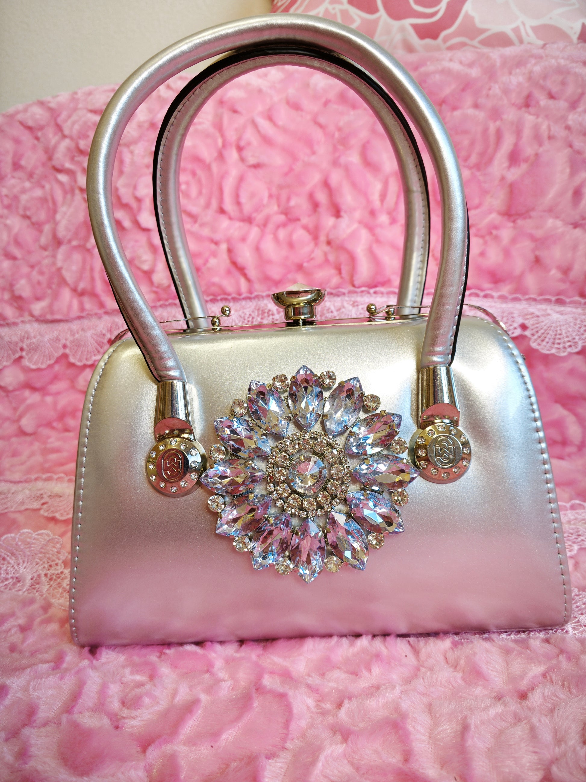 Silver Satin & Multi-Colored Crystal Floral Evening Handbag