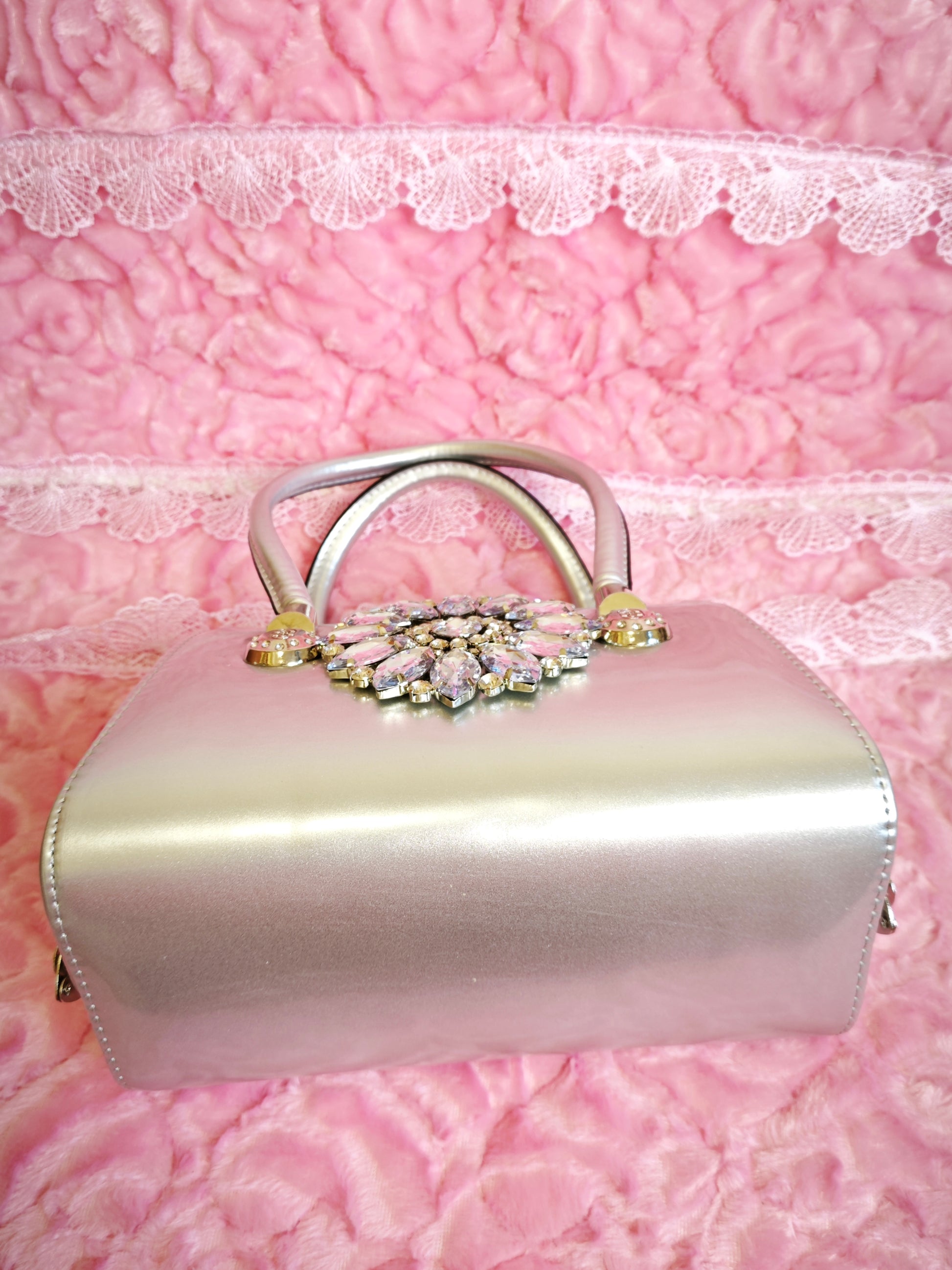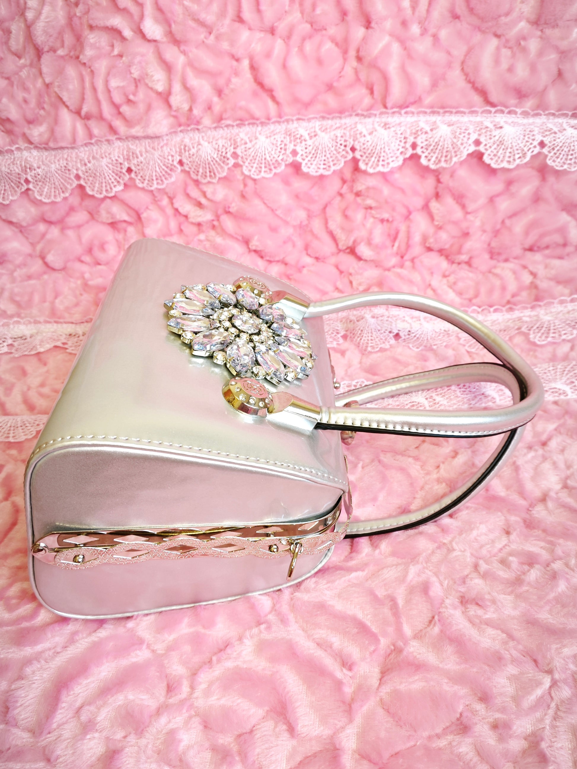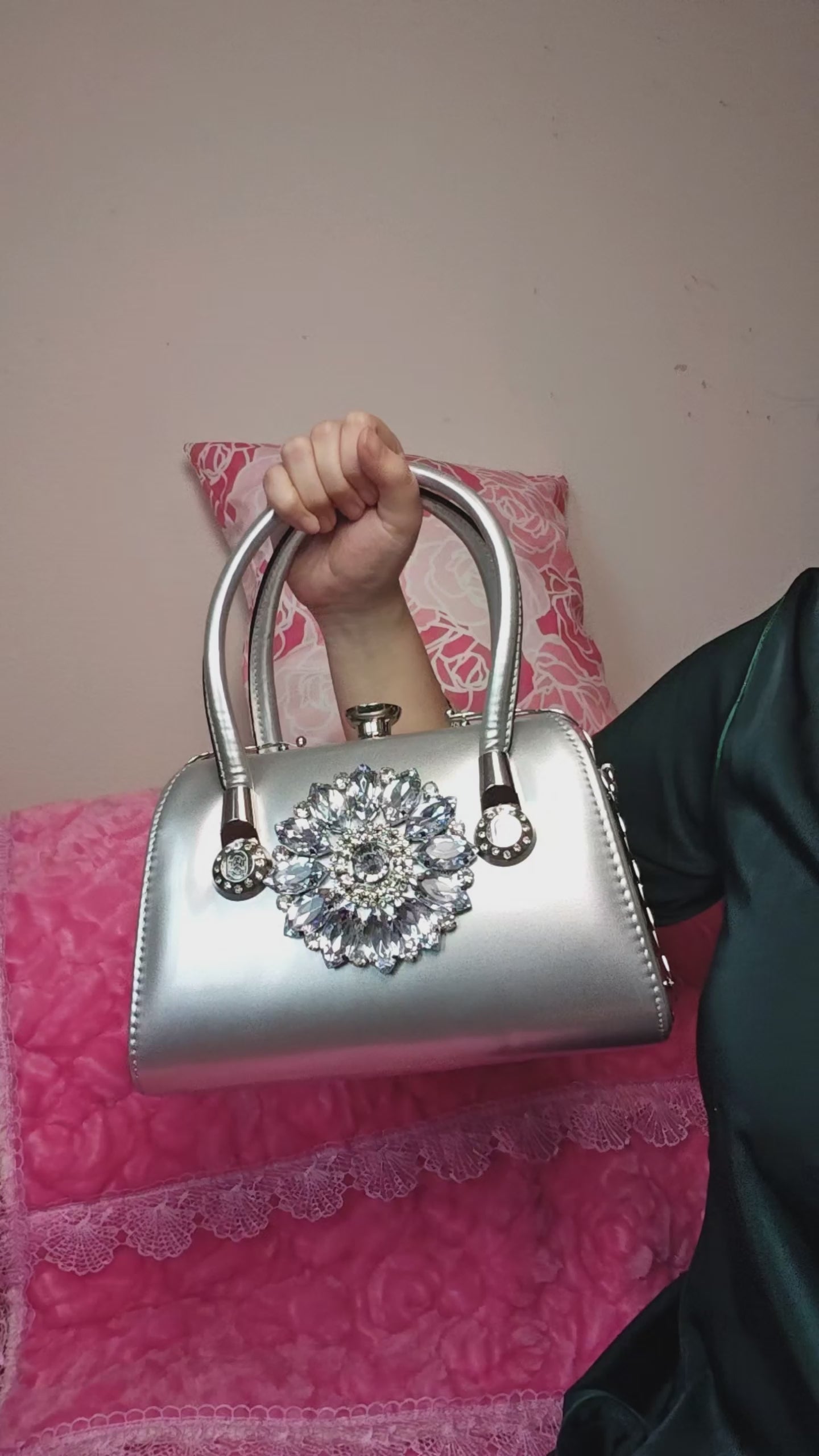 It features a classic structured hand clutch silhouette (smooth and three-dimensional lines), highlighted by "iridescent crystal flowers + metallic pearlescent fabric + gold-plated hardware". The combination of "silver pearlescent + iridescent crystal flower decoration" creates a "light luxury celebrity dinner style" with transparent iridescent crystal texture and glossy metallic pearlescent fabric luster. The stiff bag body has a "high-end atmosphere filter", and the clutch bag shape is suitable for banquets, weddings, annual meetings and other formal style scenarios, making it a "luxurious highlight" for outfits.