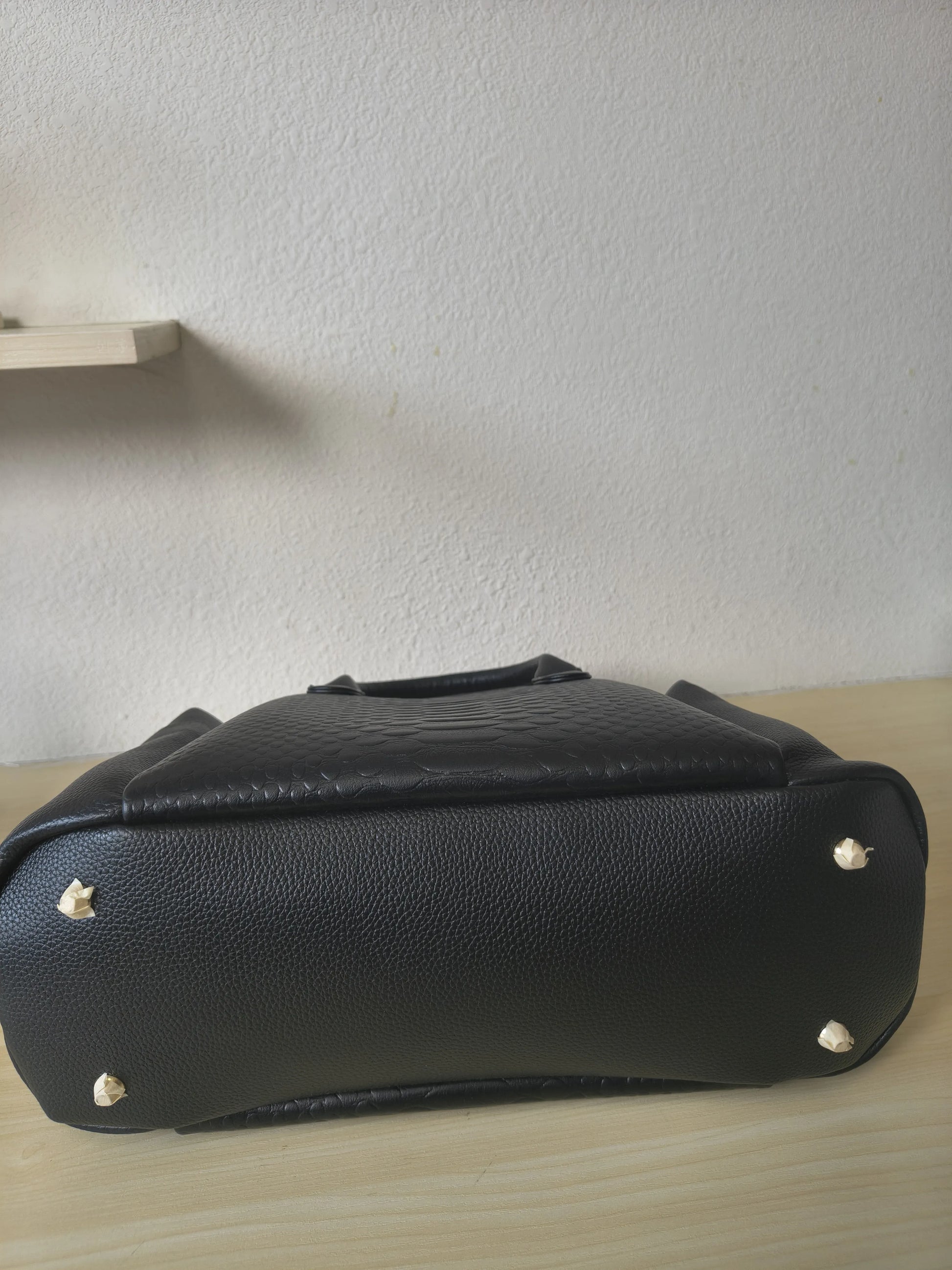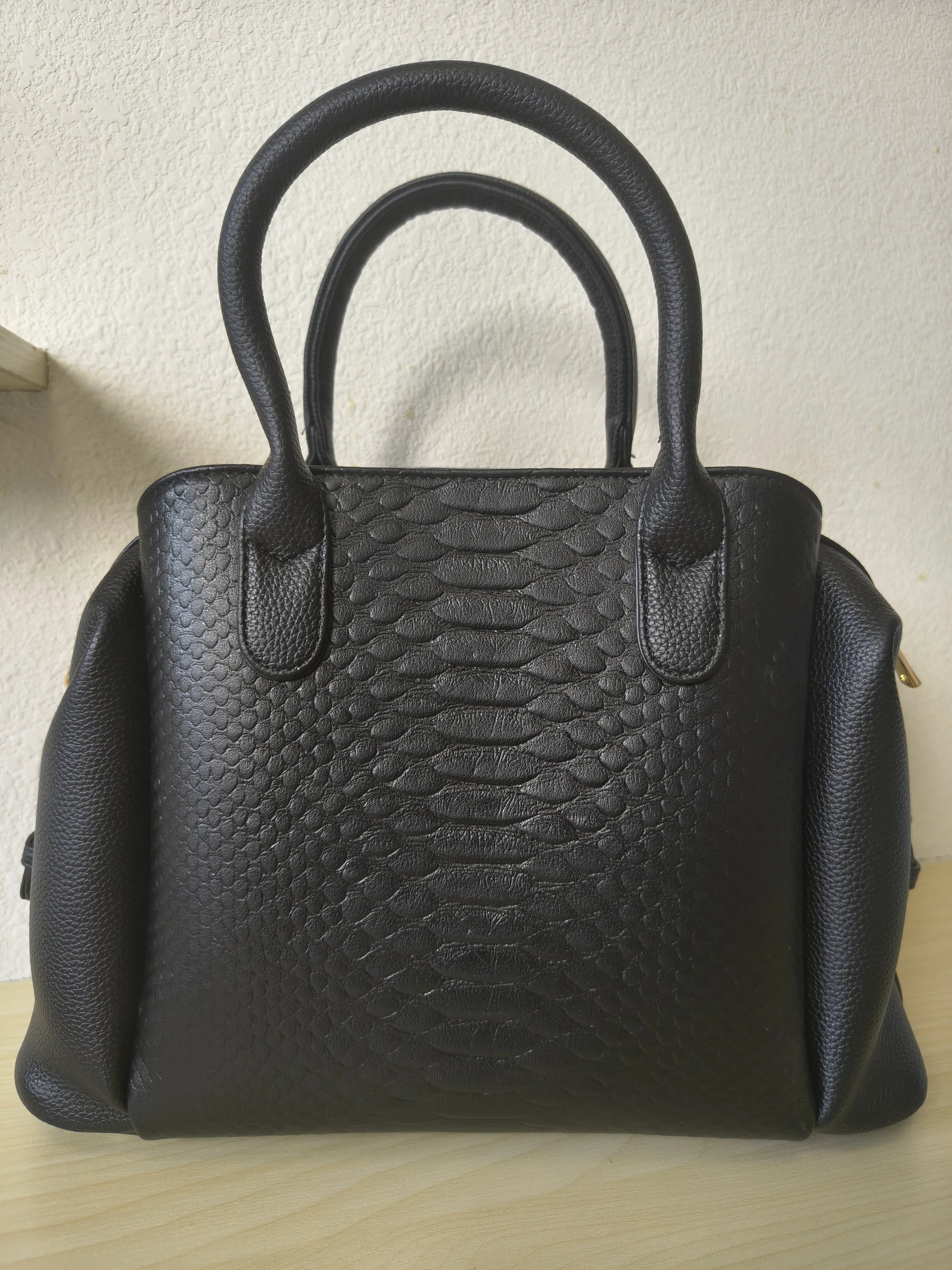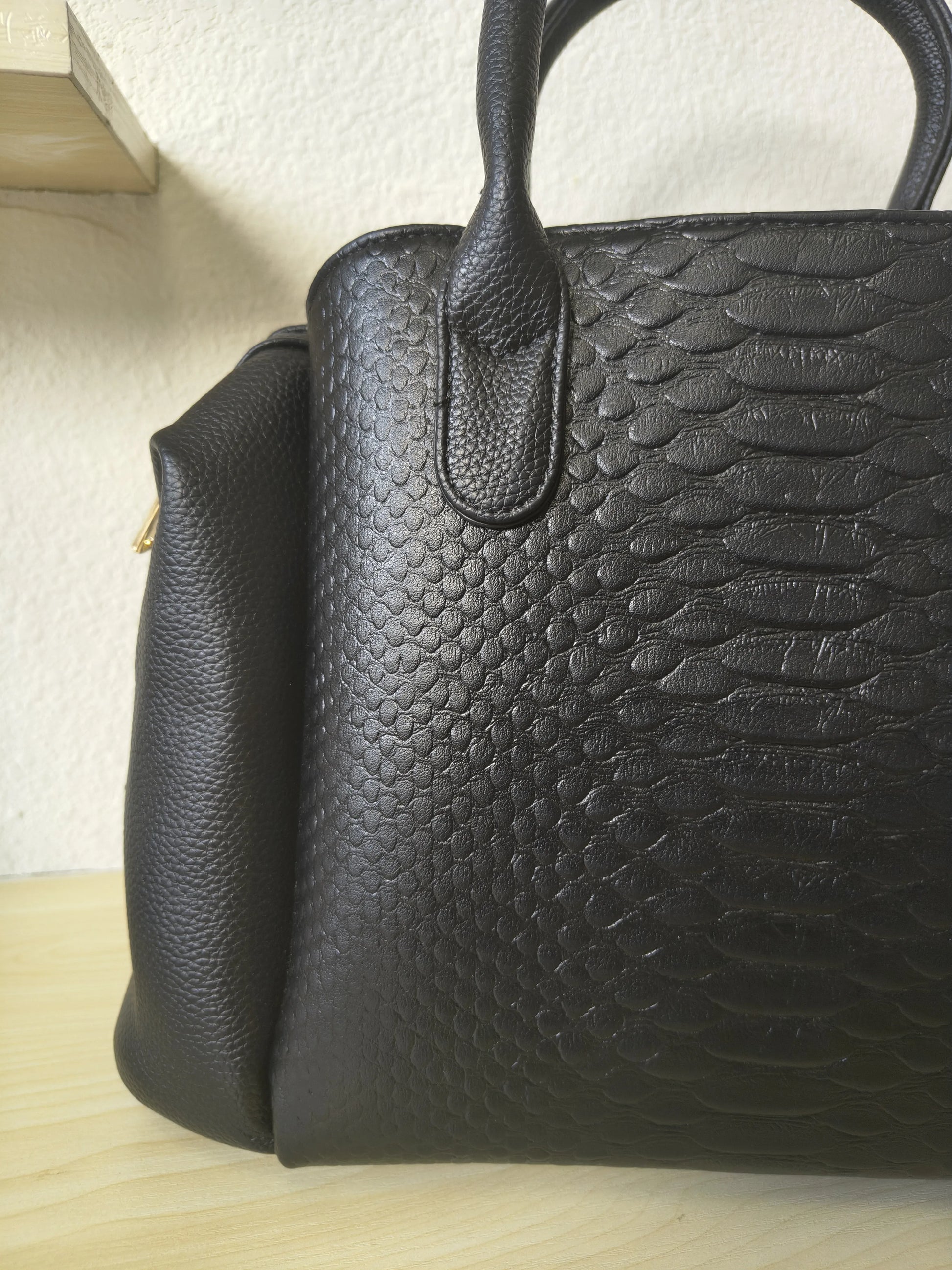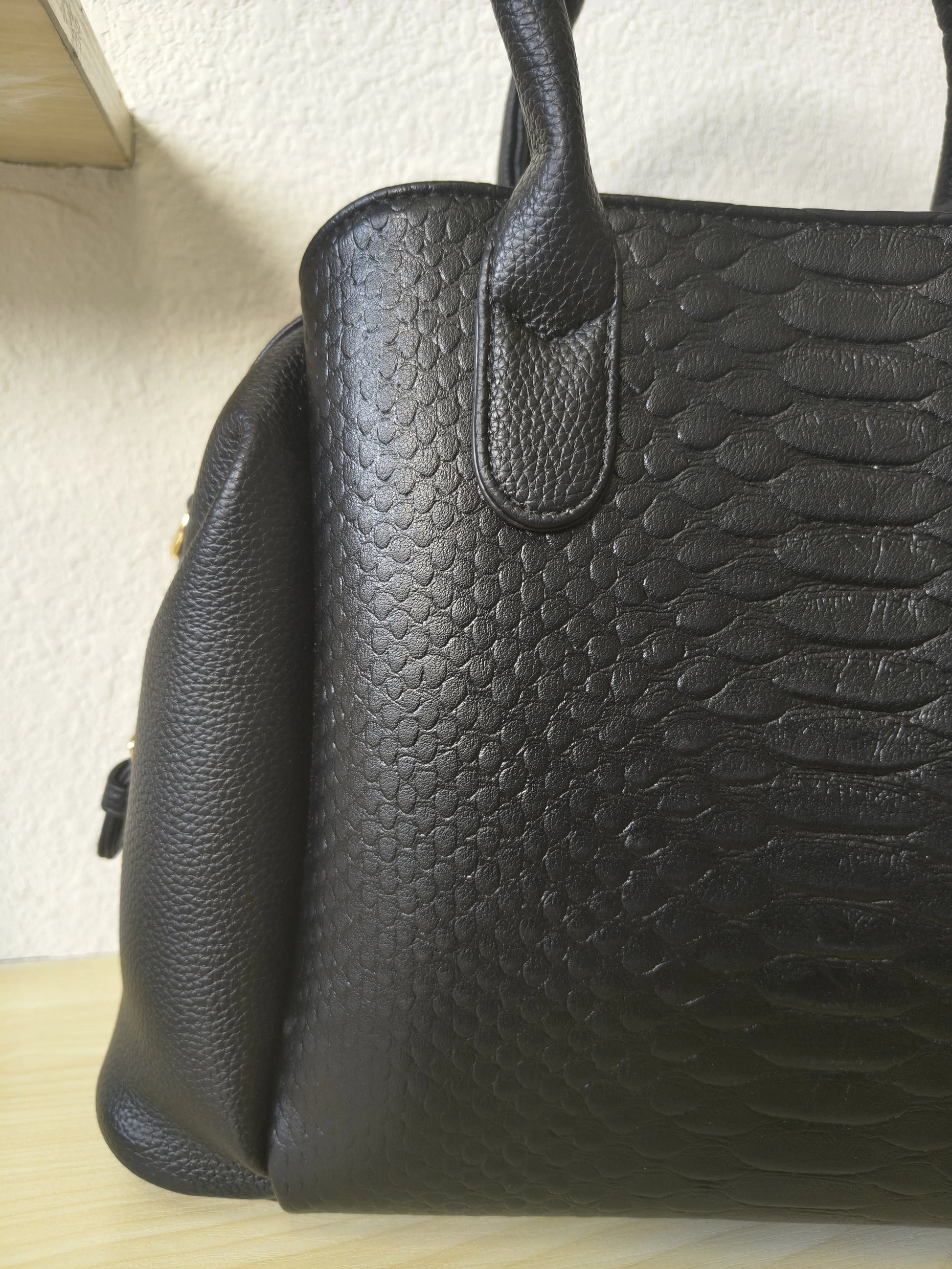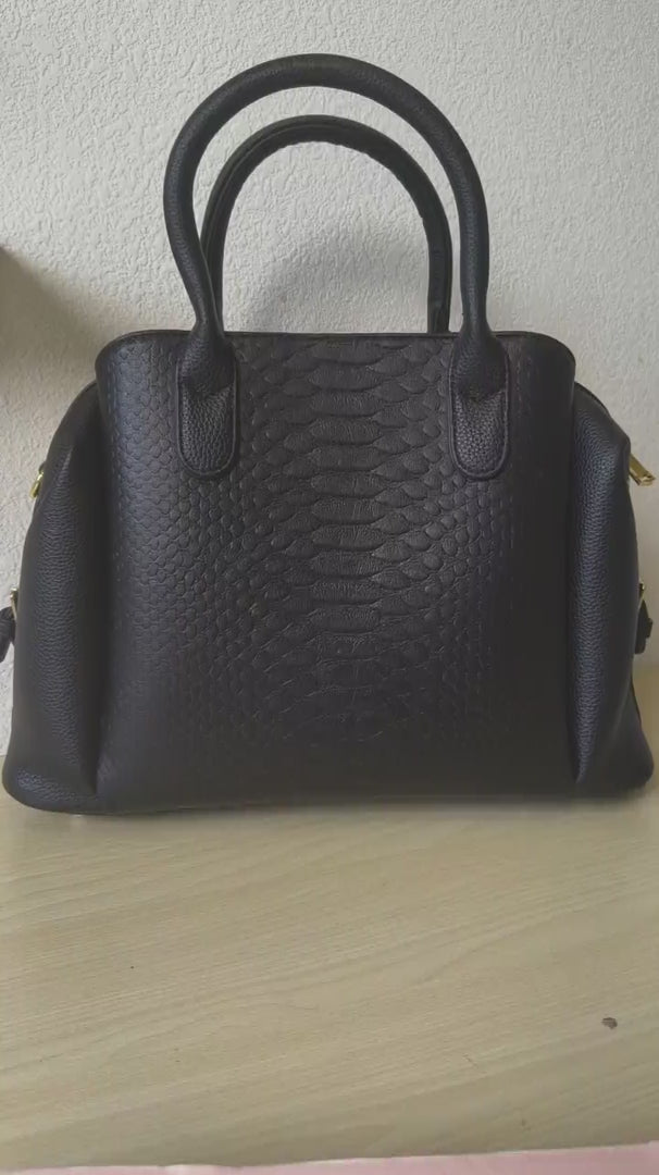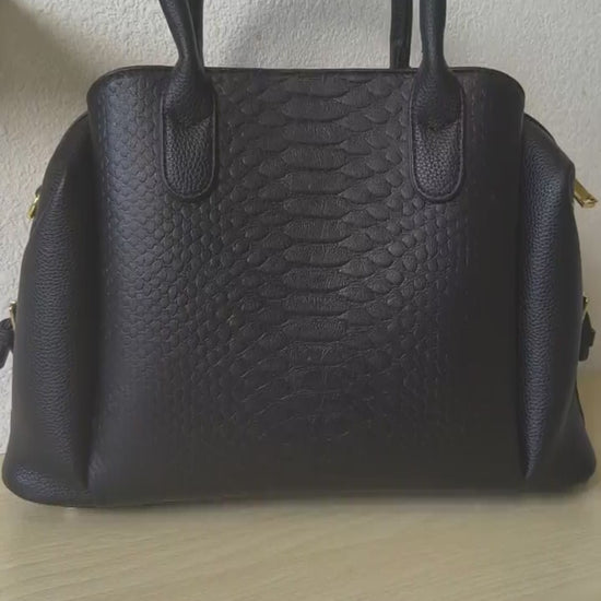 Elegant Boston silhouette with 3D Python & fish scale texture, gold-tone hardware and matching black handle, timeless light luxury style.